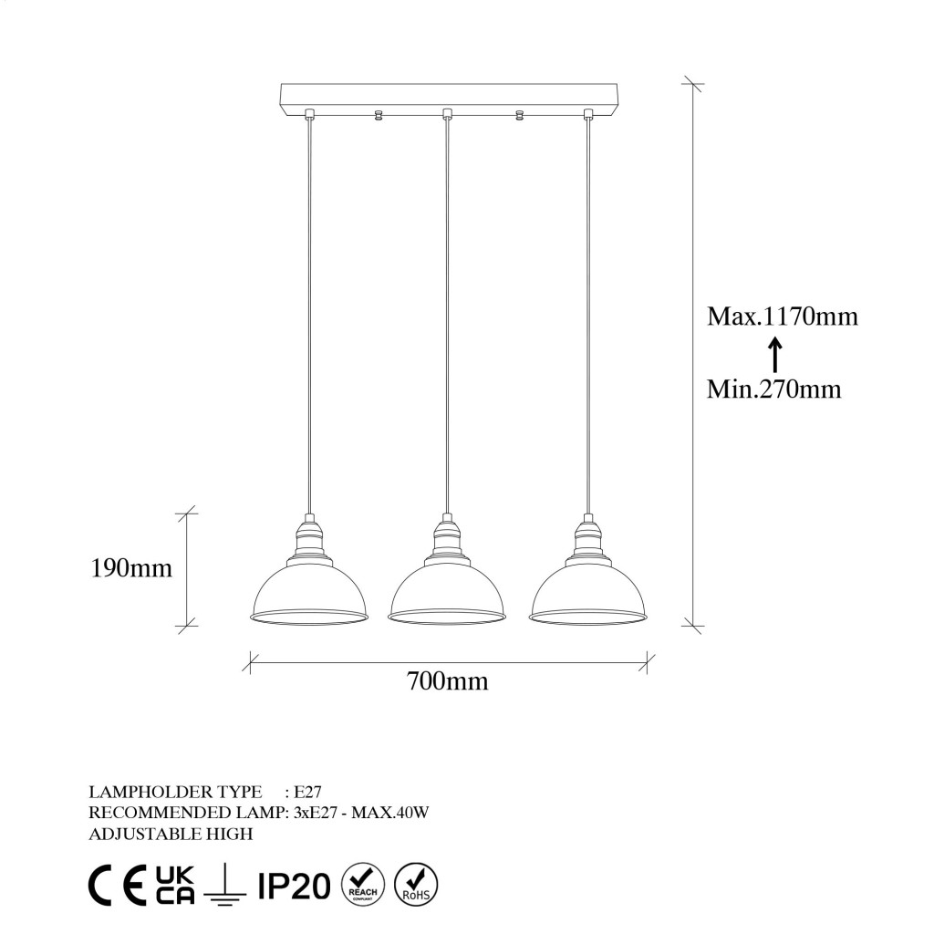• Aljzat típusa: 1,5 mm: Max 40 W 3 x E27