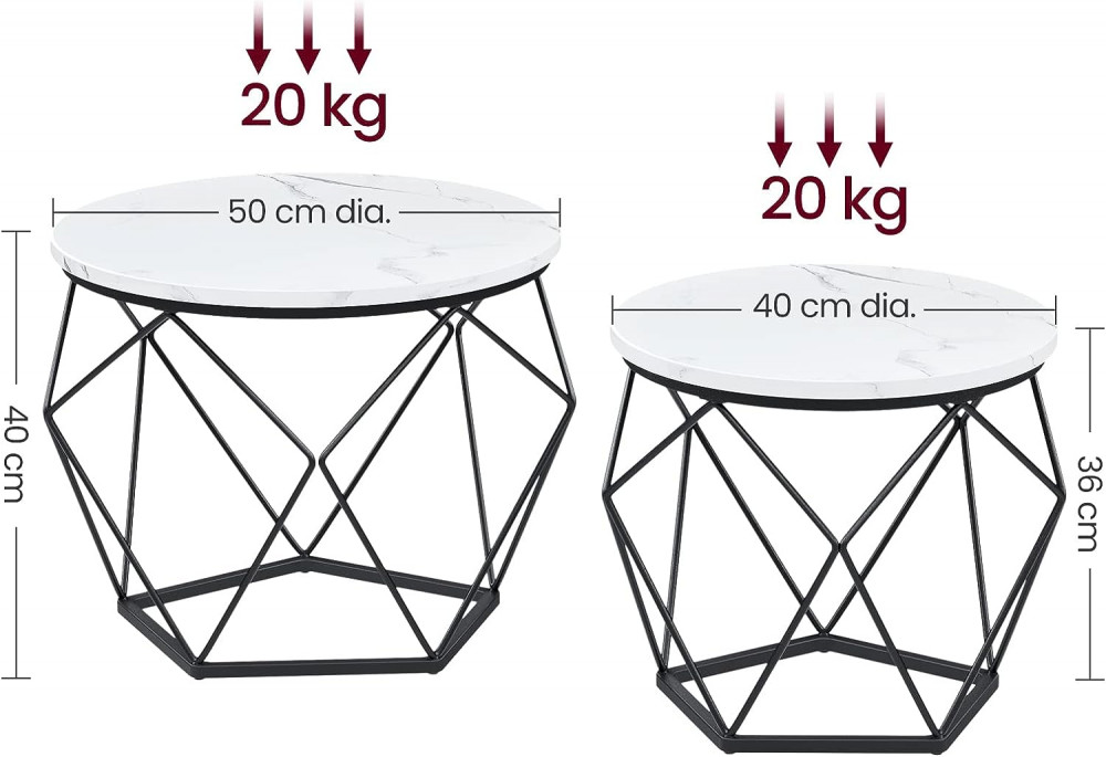 Kompakt Méret: A nagy dohányzóasztal mérete 50 x 40 cm (Átm. x M), a kis dohányzóasztal mérete pedig 40 x 36 cm (Átm. x M); a kompakt méret, amely alkalmas kis terekbe, lehetővé teszi, hogy megtalálja a megfelelő helyet a délutáni teához, dekorációkhoz vagy egy laptophoz a munkához