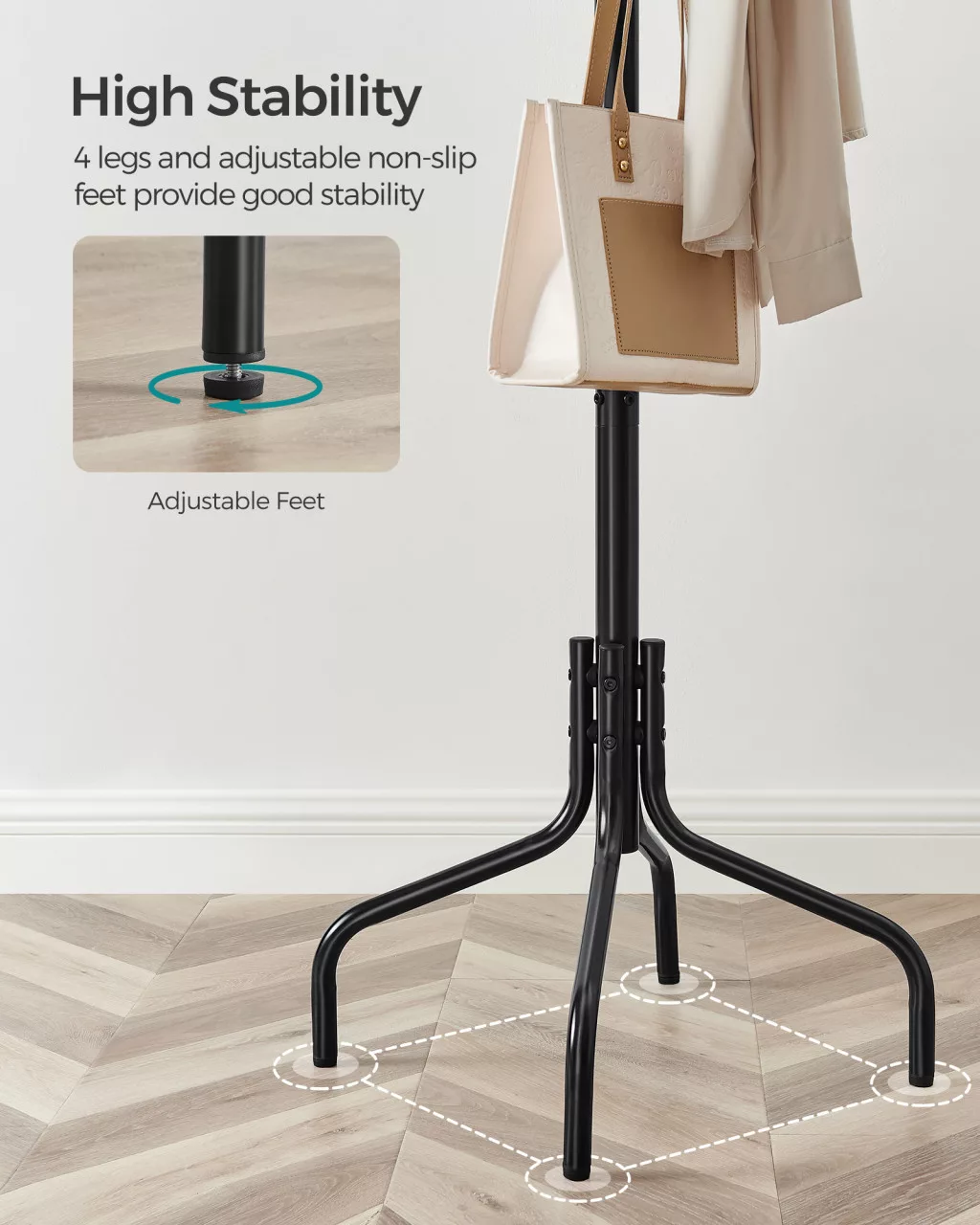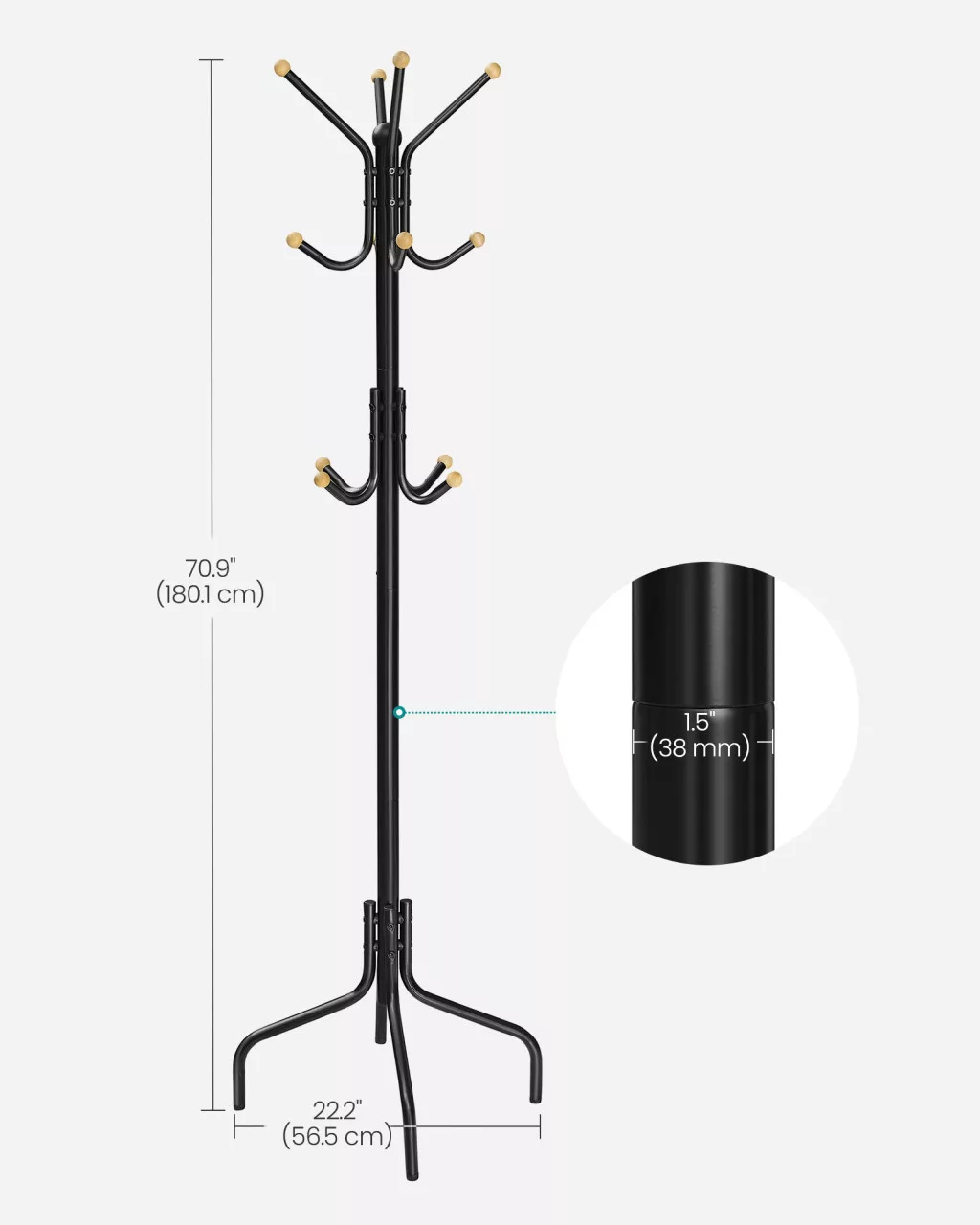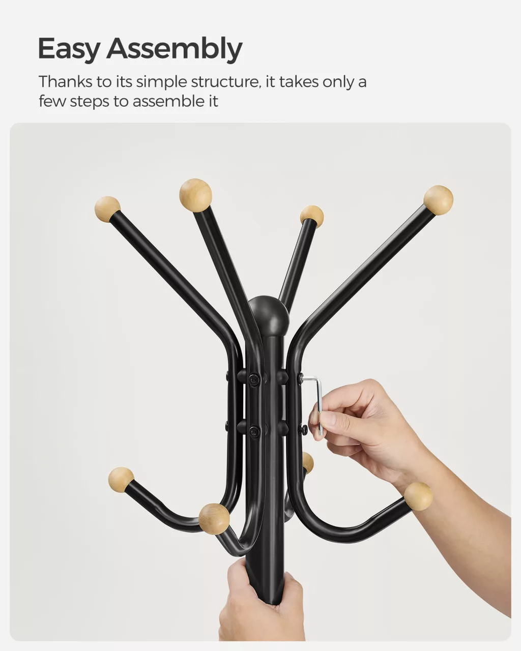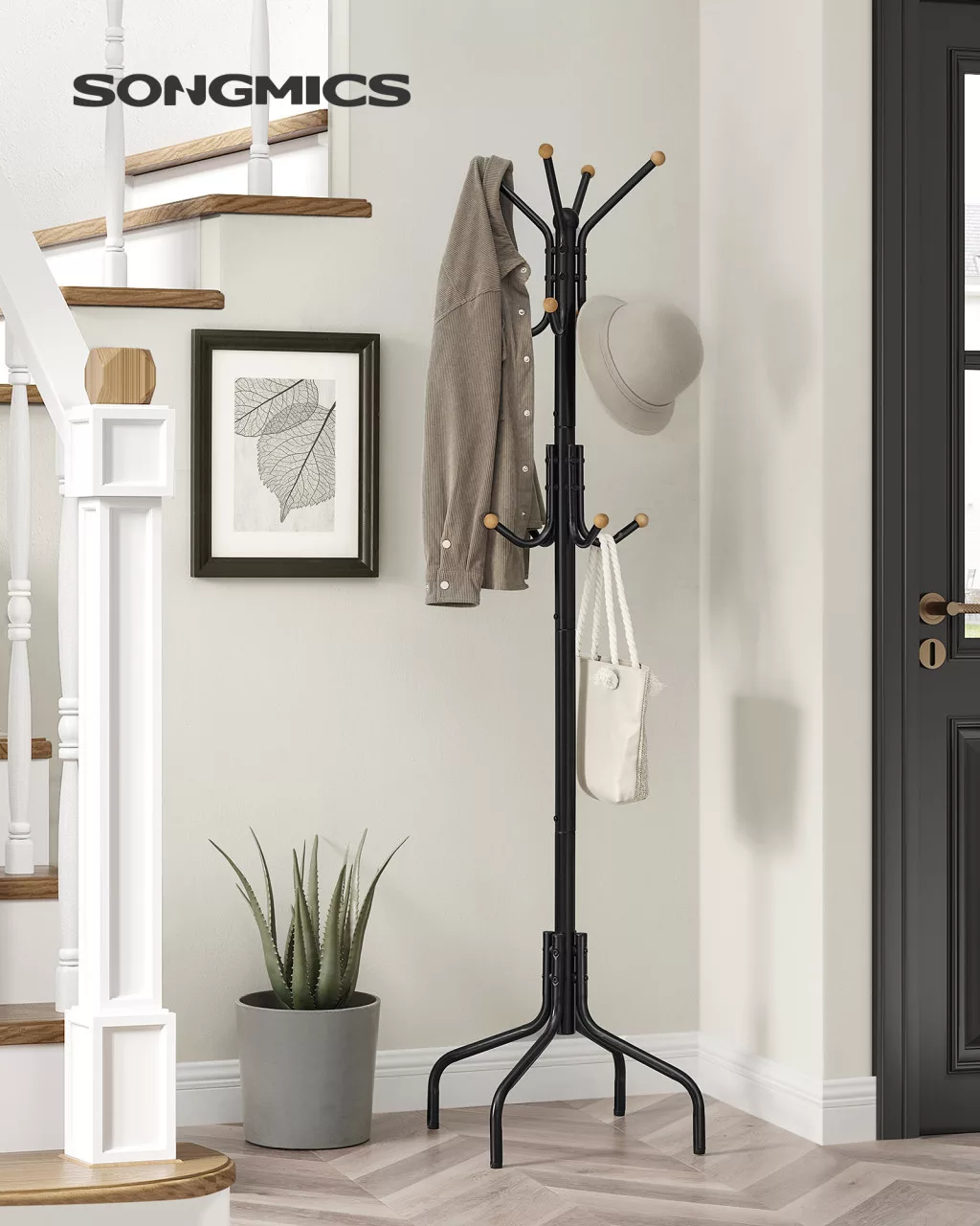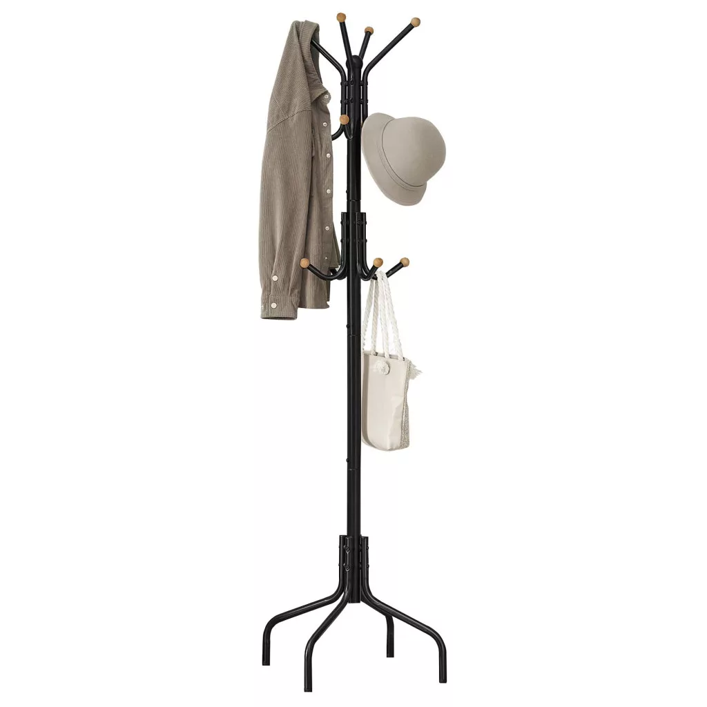 Ez a fekete álló fém ruhafogas tökéletes megoldás a rend és a szervezettség fenntartására otthonában vagy irodájában. A 12 akasztóval rendelkező ruhafogas nemcsak a kabátok, hanem a sálak, kalapok, táskák és esernyők tárolására is ideális, így minden egy helyen, könnyen elérhetően tartható.