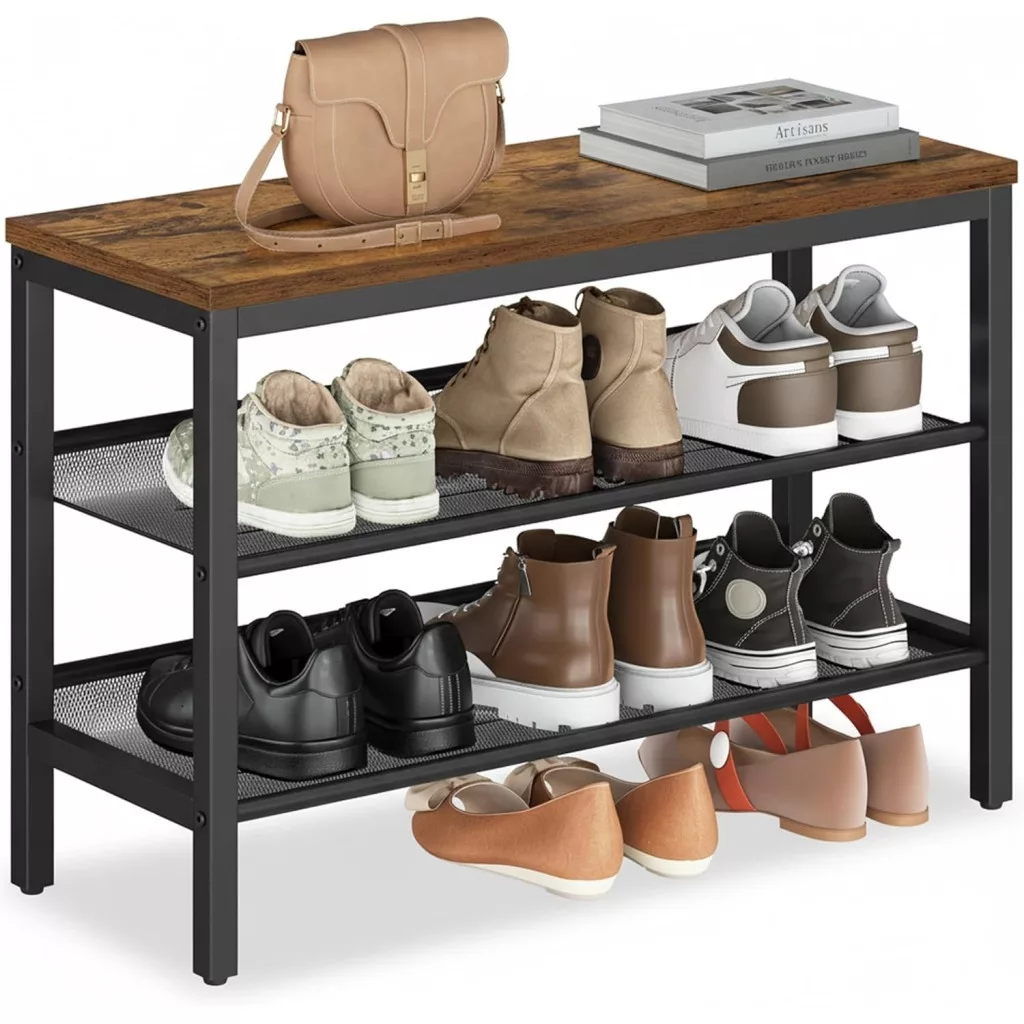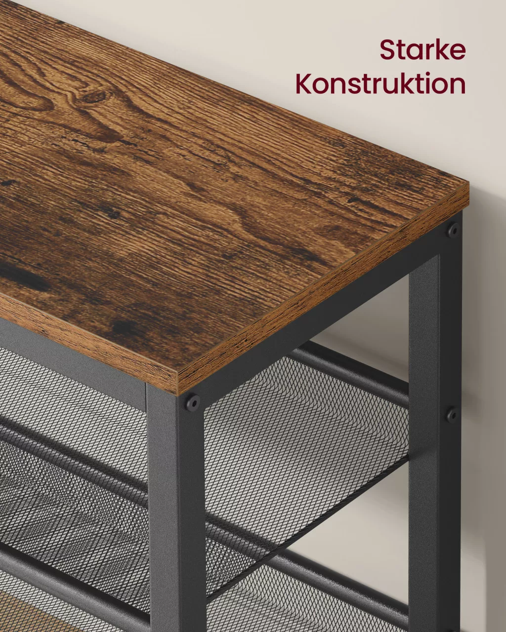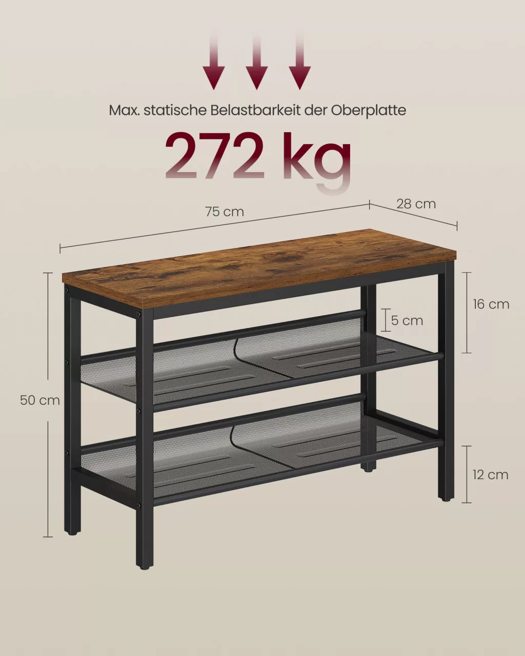 A három szintes cipőtároló pad ideális megoldás a rend és a stílus megteremtésére otthonában. A rusztikus barna és matt fekete színkombinációja egyedi karaktert ad a bejáratának, nappalijának vagy fürdőszobájának. Az ipari stílusú dizájn nemcsak esztétikus, hanem rendkívül praktikus is.