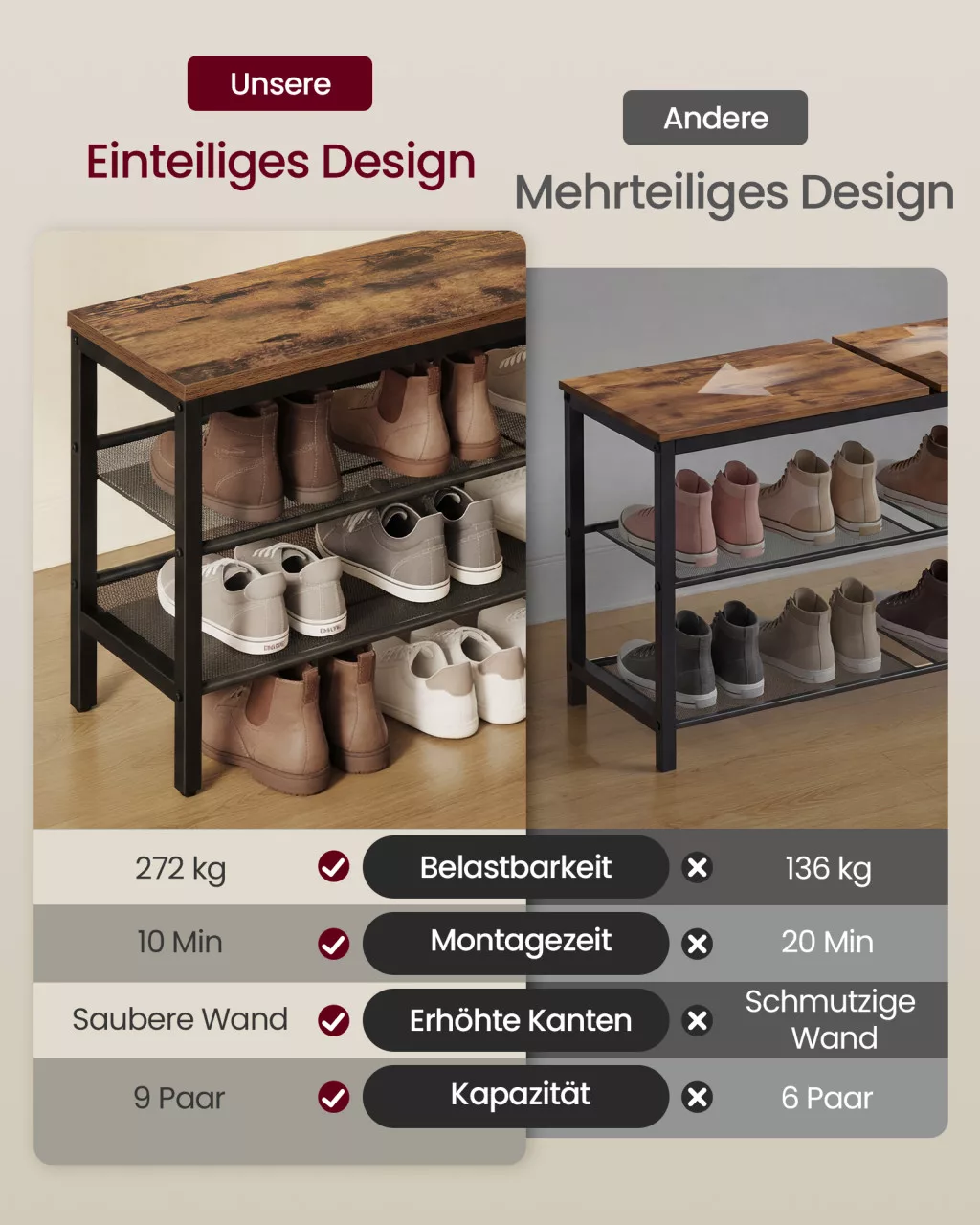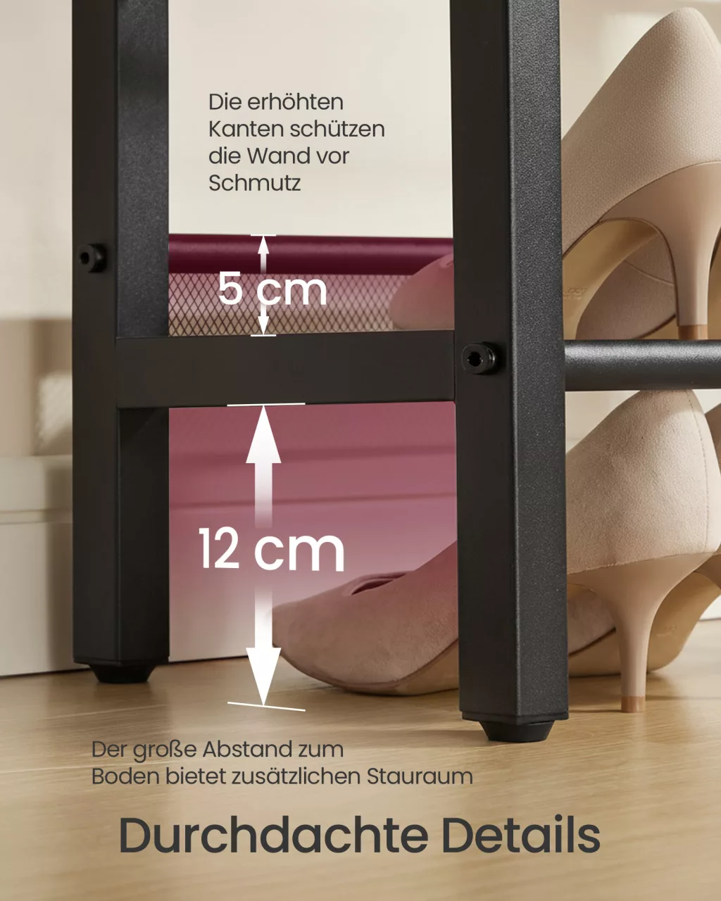 • Praktikus védelem: A megemelt hátsó él megakadályozza a falak koszolódását és a cipők leesését, így biztonságosan használhatja minden nap.