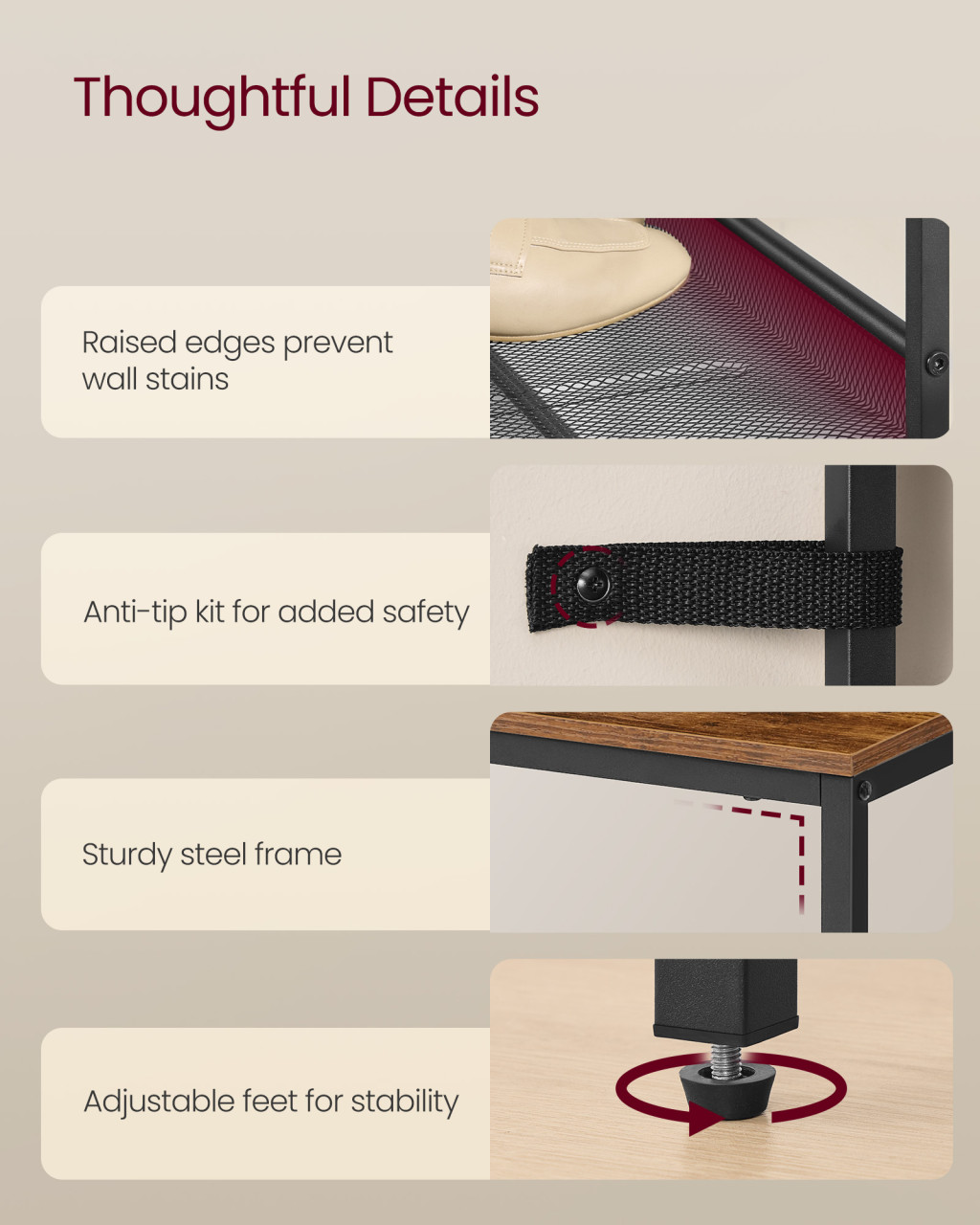 • Rendkívül praktikus: A polcok laposan vagy szögben is rögzíthetők, a hátsó emelt perem pedig megvédi a falat a cipők által okozott szennyeződésektől.
