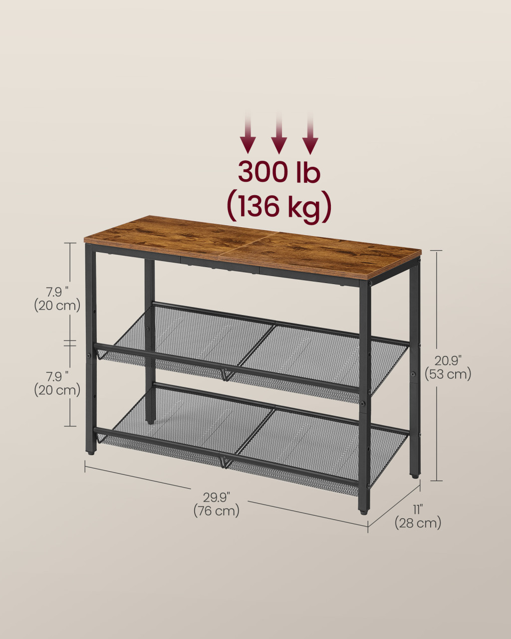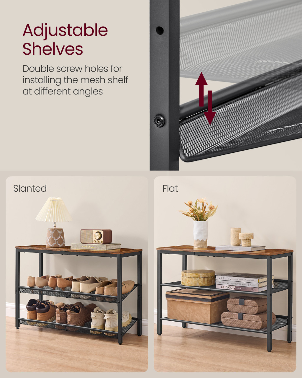 Ez a 3 szintes cipőtároló polc ideális megoldás a rend és a stílus megteremtésére otthonában. A rusztikus barna szín és a fém hálós polcok kombinációja nemcsak praktikus, hanem esztétikus is, így tökéletesen illeszkedik bármilyen belső térbe.