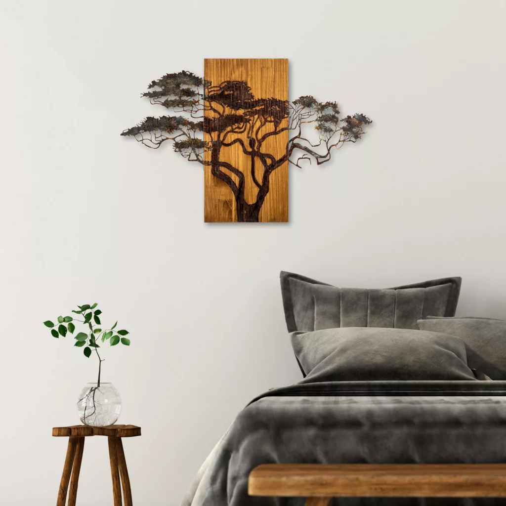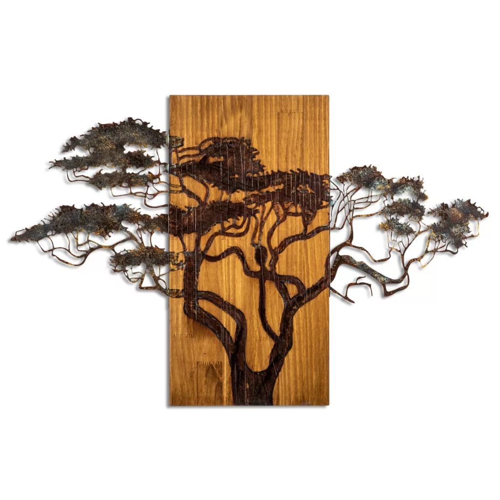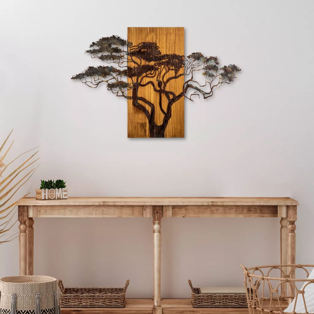 A 100% -ban valódi fából készült, fali tartozékunk természetes varázsa, amely páratlan. Minden darab gondosan kézzel festett, és hozzáadja a művészi és a karakter egyedi érintését. A fa keret vastagsága 3 cm, biztosítva a tartósságot és a hosszú élettartamot. Az 1,5 mm vastagságú fém díszítés feltűnő kontrasztot biztosít, és hozzáadja a kortárs eleganciát a formatervezéshez.