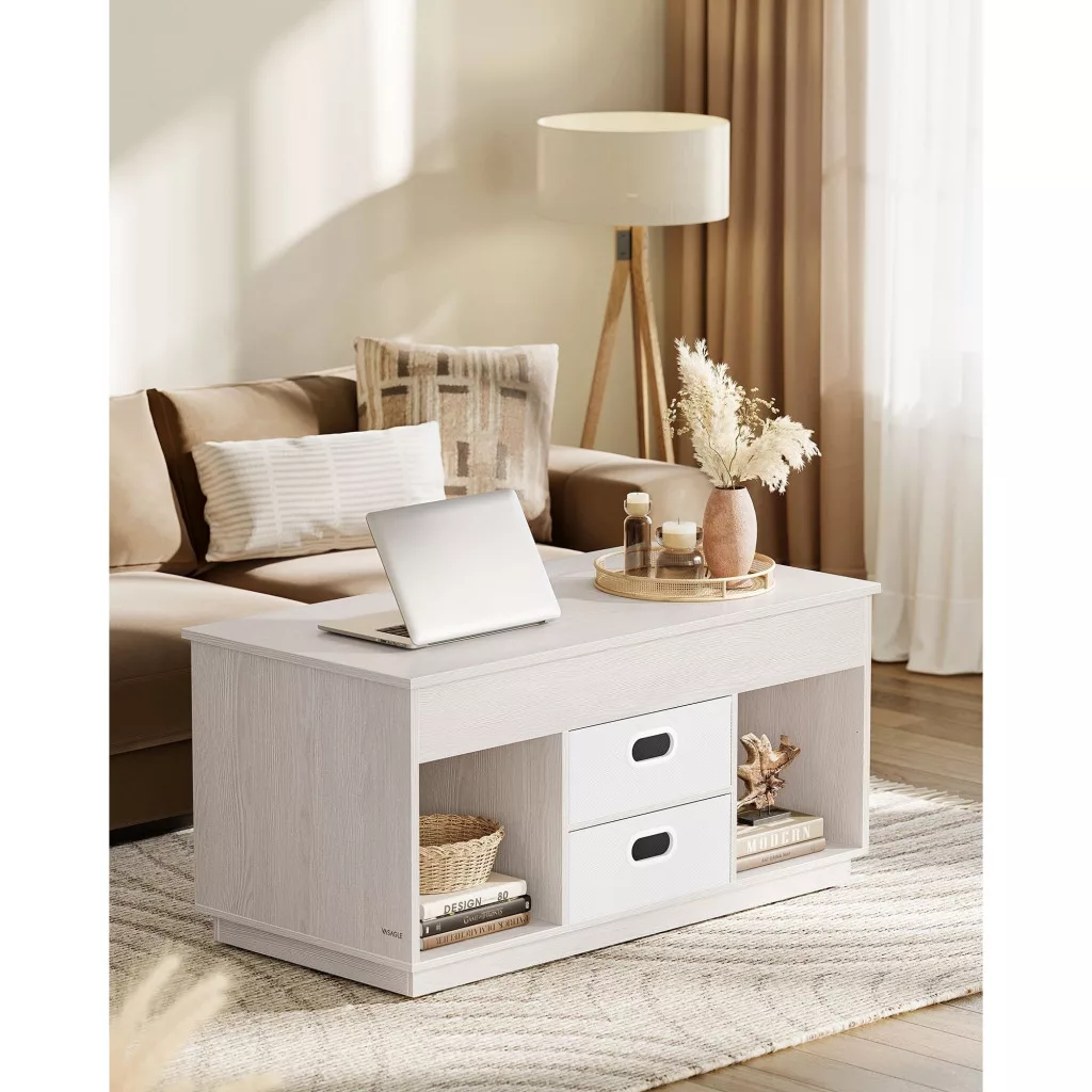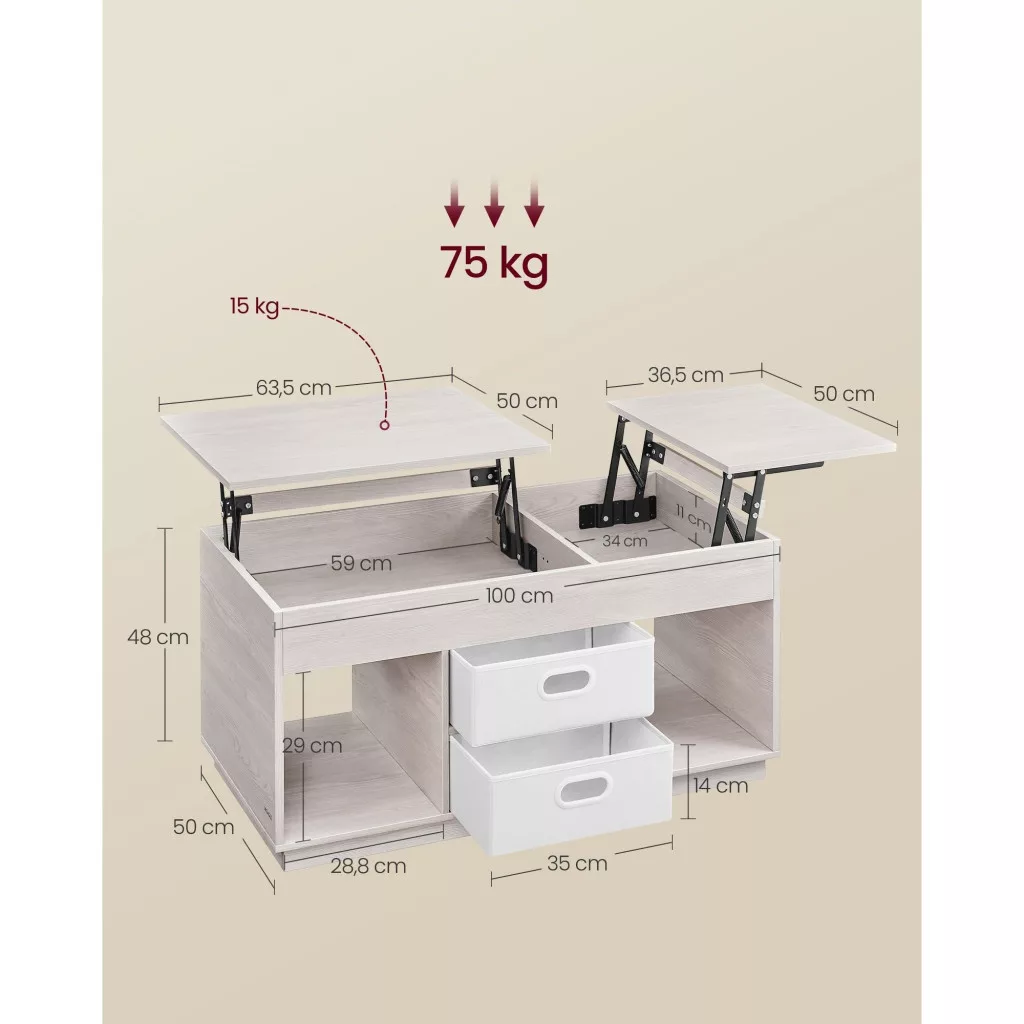 Dohányzóasztal, emelhető asztallap, két fiókkal, tárolóval, greige 100x50x45cm