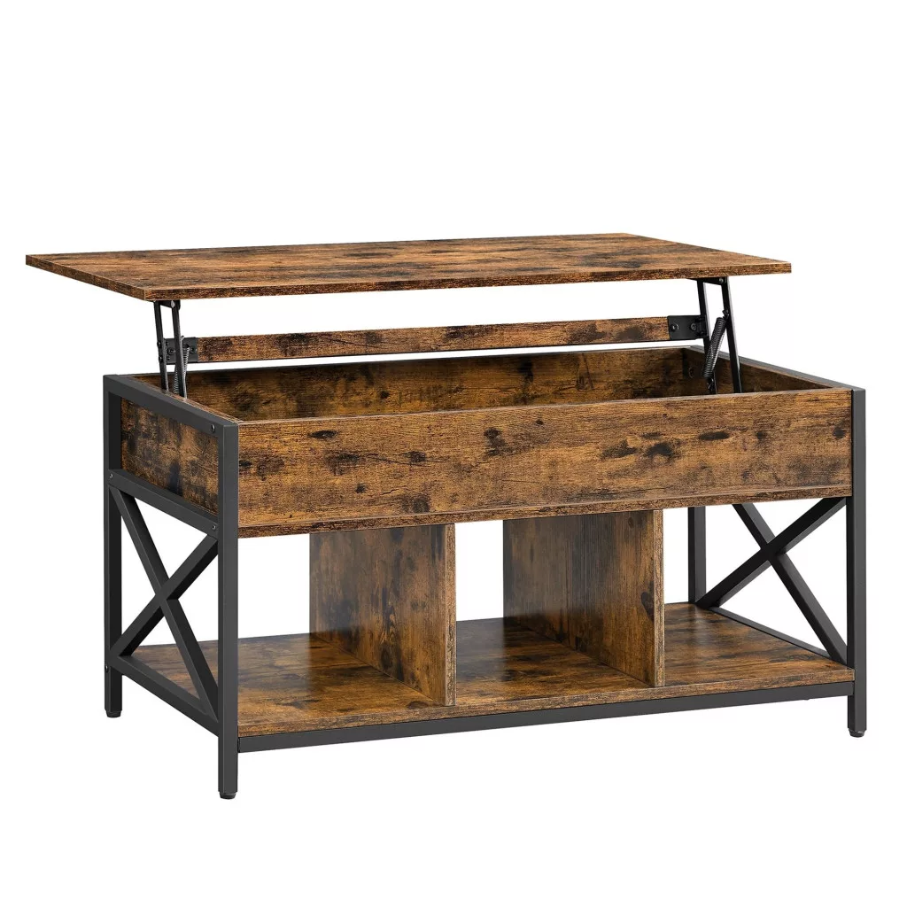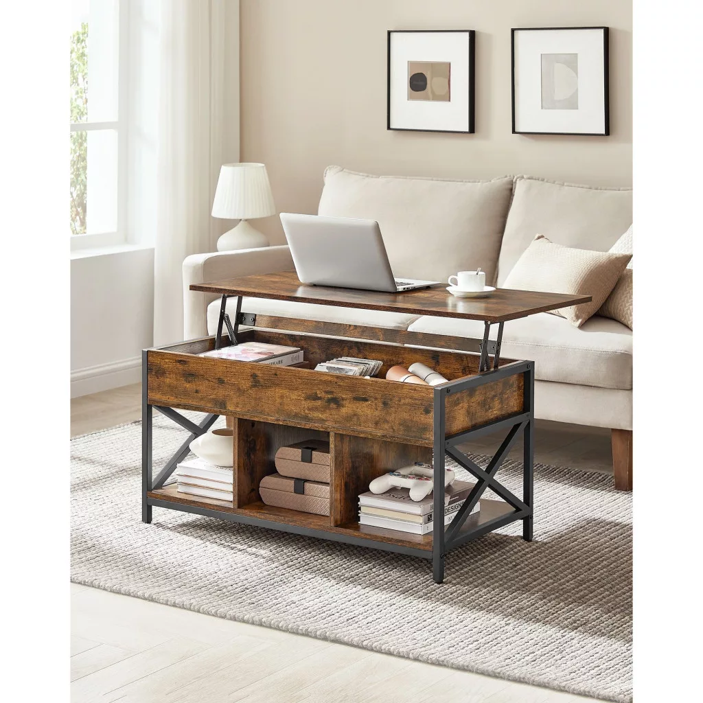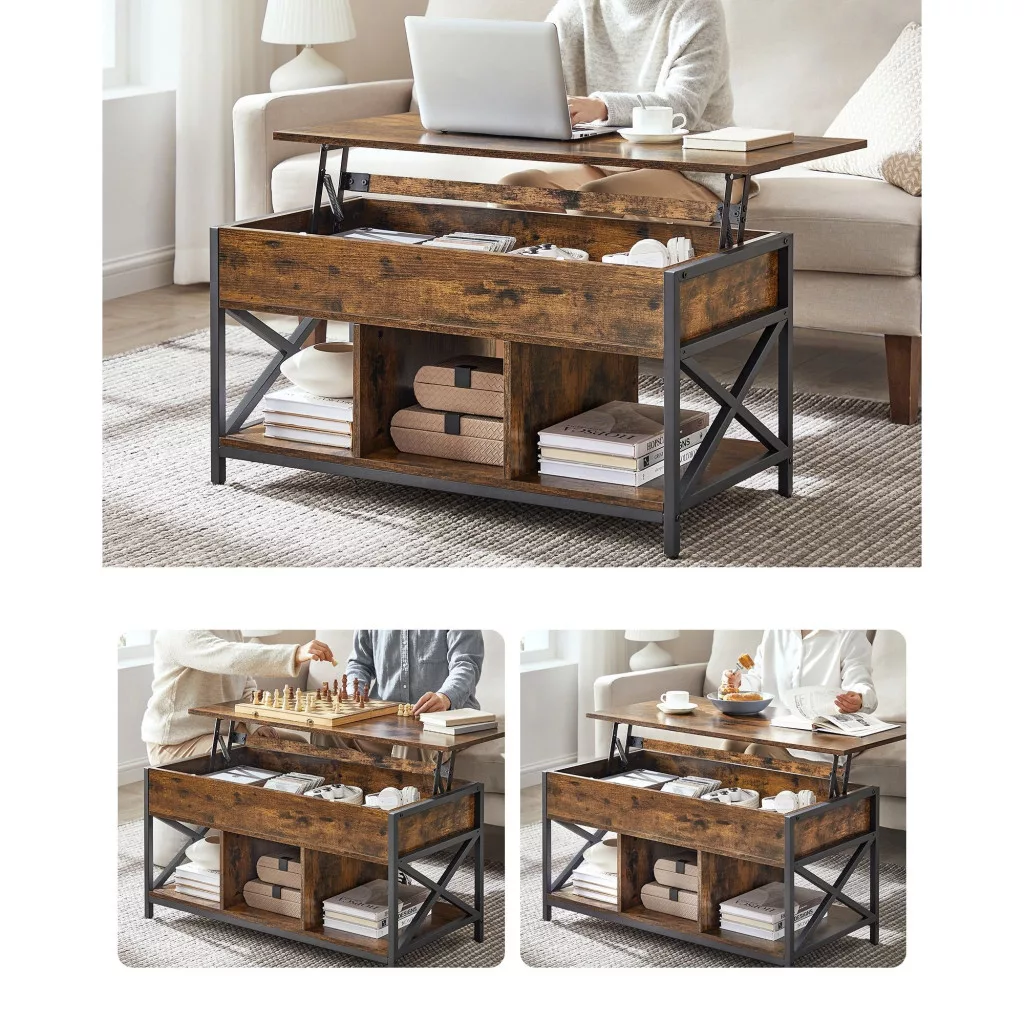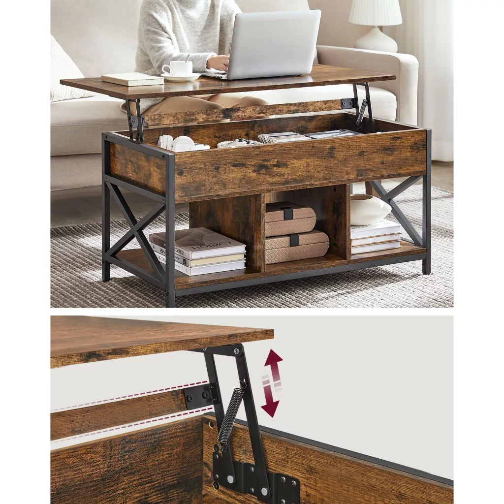 Dohányzóasztal, emelhető asztallappal, rejtett tárolóval, rusztikus barna és fekete