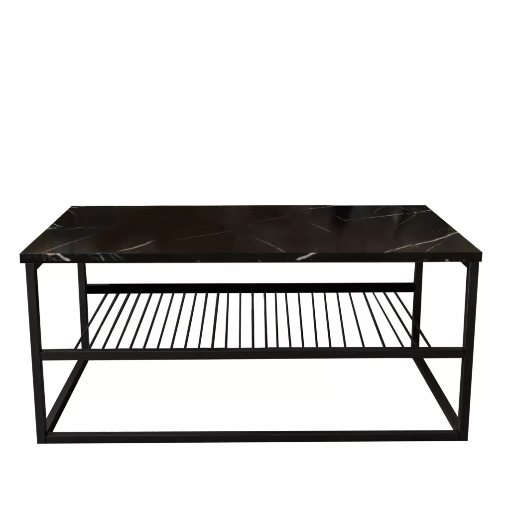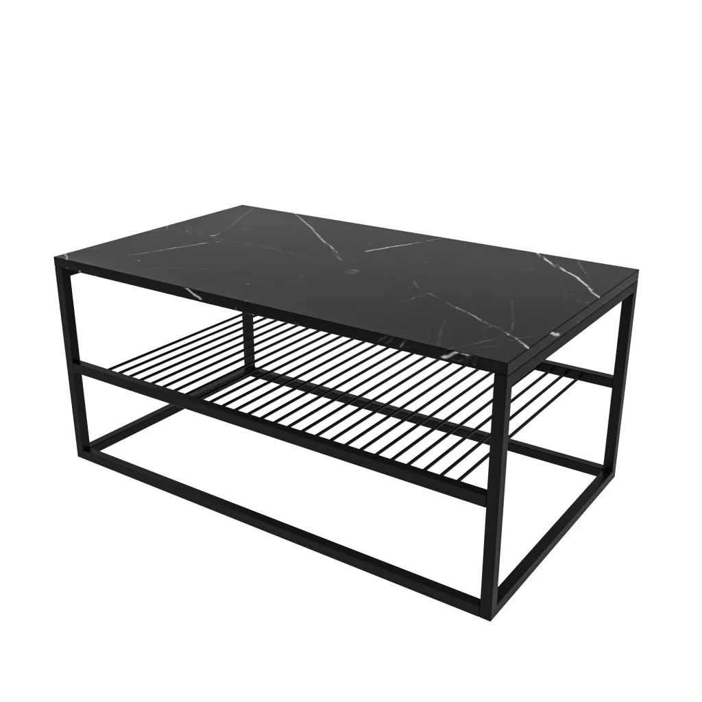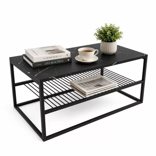 A kávasztal elegáns fekete színe és ipari dizájnja azonnal feldobja a nappali esztétikáját. Tiszta vonalai és elektrosztatikus porbevonatú fém lábai kortárs megjelenést kölcsönöznek, amely lenyűgözi vendégeit és hangsúlyos eleme lesz otthonának.