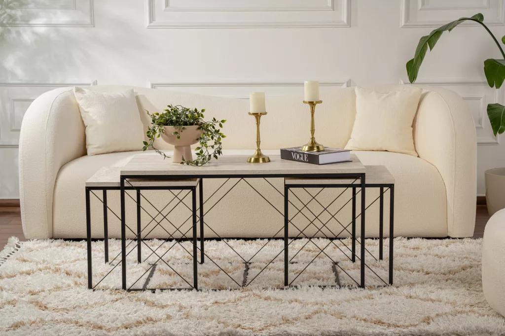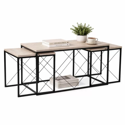 Ez a kávasztal szett nem csupán bútor, hanem egy kijelentés, amely új magasságokba emeli otthona dekorációját. A nagyobb kávasztal elegendő felületet biztosít szórakoztatáshoz vagy kedvenc dekorációs tárgyai bemutatásához, míg a két kisebb asztal az Ön igényei szerint rendezhető.
