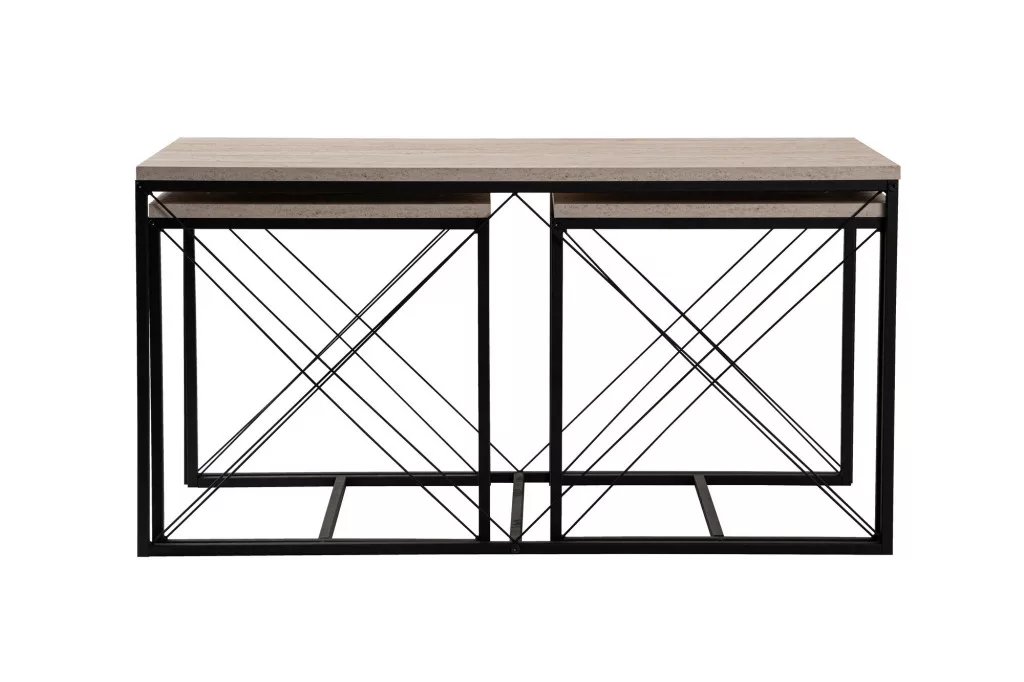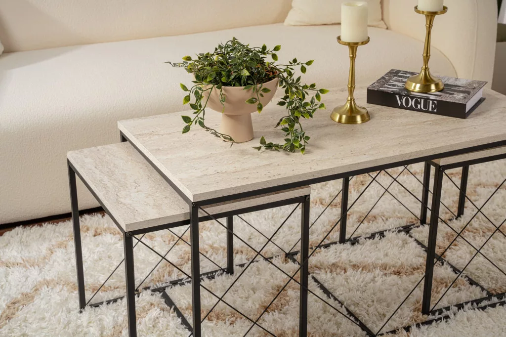 Alakítsa át életterét lenyűgöző Márvány Kávasztal Szettünkkel. 100%-ban melamin bevonatú forgácslapból készült, ez a szett eleganciát és kifinomultságot sugároz. A karcsú fém lábak modern érintést adnak, míg a travertin és fekete színkombináció luxus érzetet teremt.