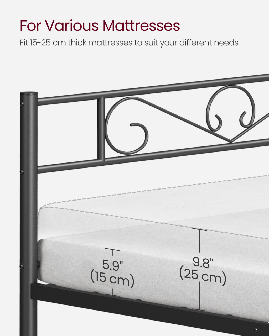 • Robusztus és stabil: A kiváló minőségű támogatósávok és a 6 erős fém láb garantálják az ágykeret stabilitását, maximális terhelhetősége 150 kg, így nem kell aggódnia a nyikorgás vagy a mozgás miatt.