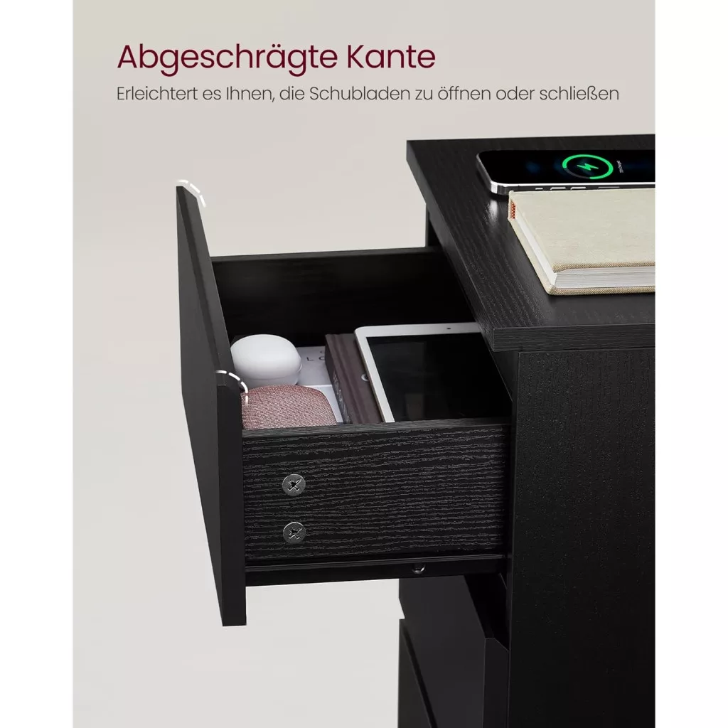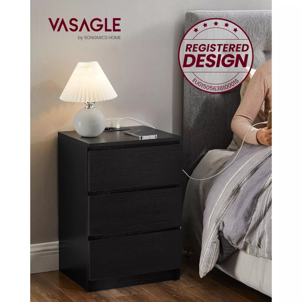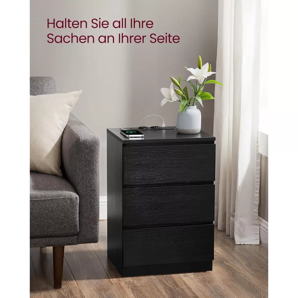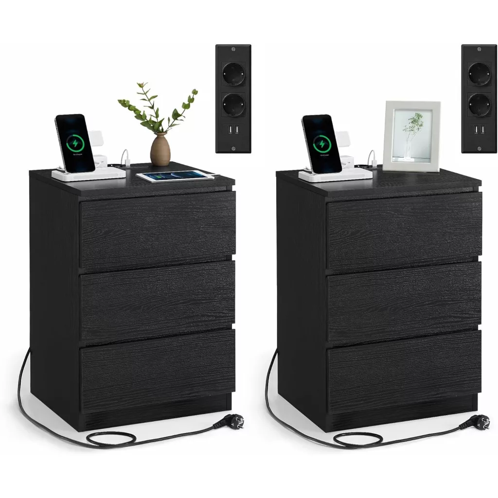 Éjjeliszekrény, 3 fiók, 2 USB port, modern, ébenfekete, 40 x 35 x 59 cm