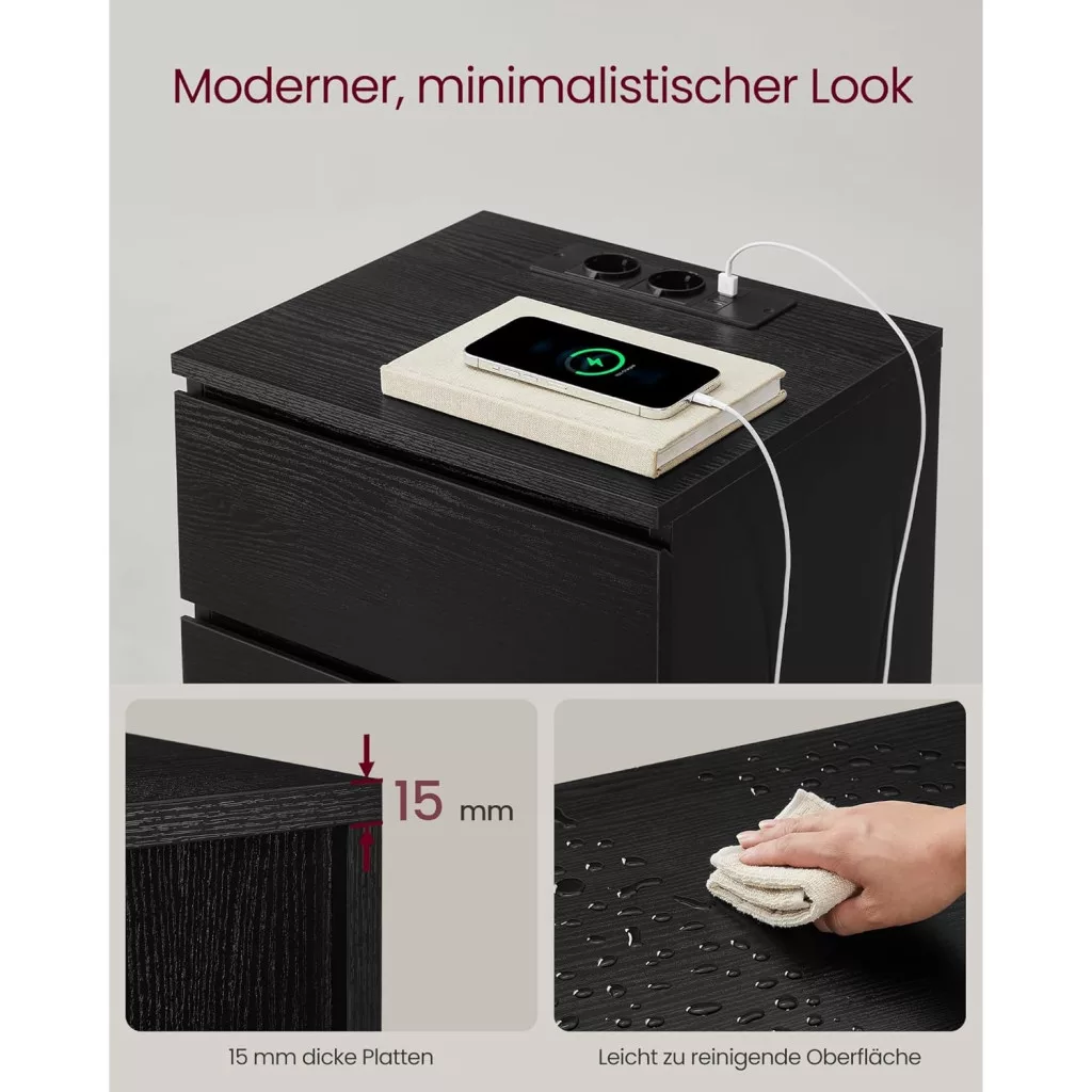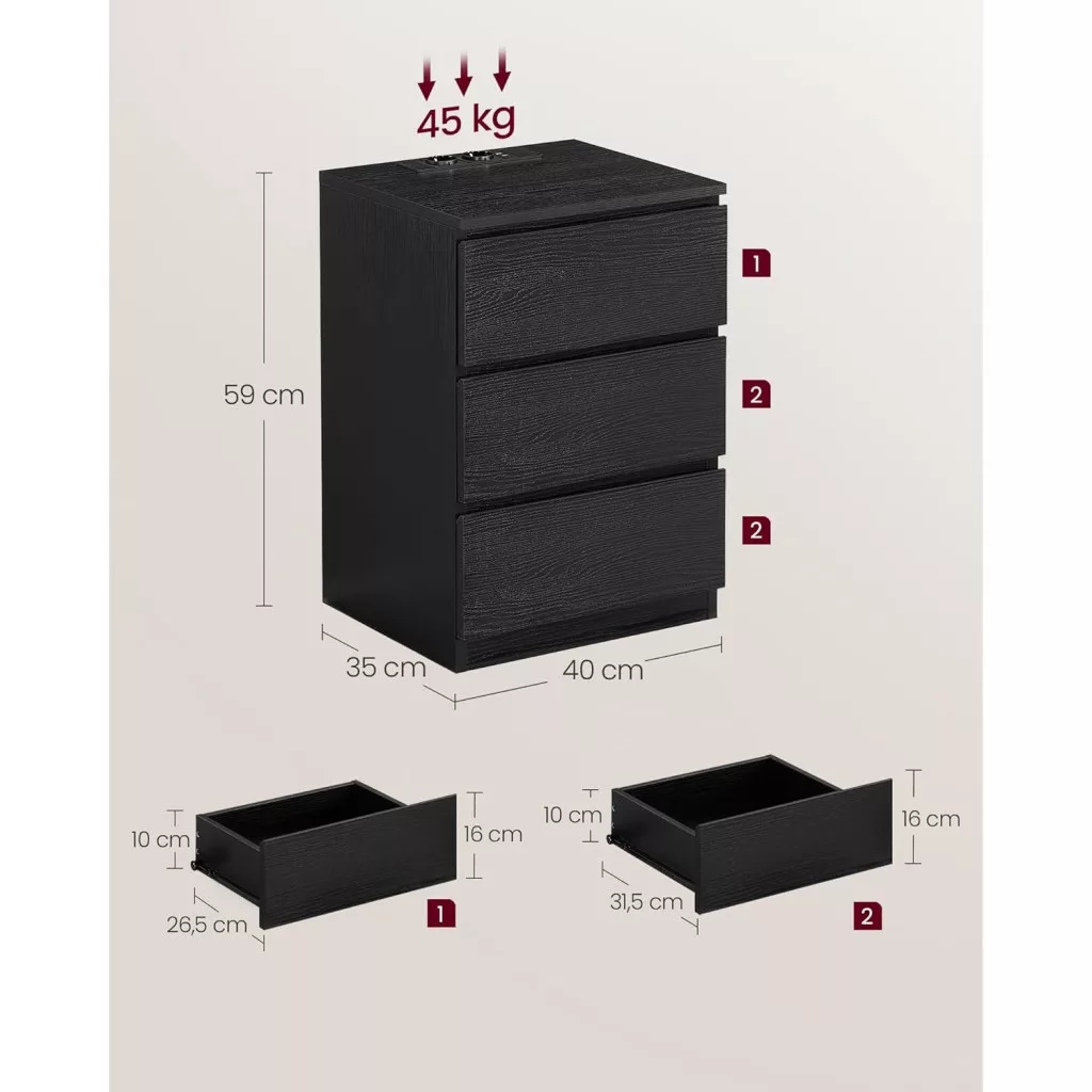 • Tartós anyagok: A 15 mm vastag forgácslapból készült éjjeliszekrény robusztus és tartós, akár 62 kg-ot is elbír.