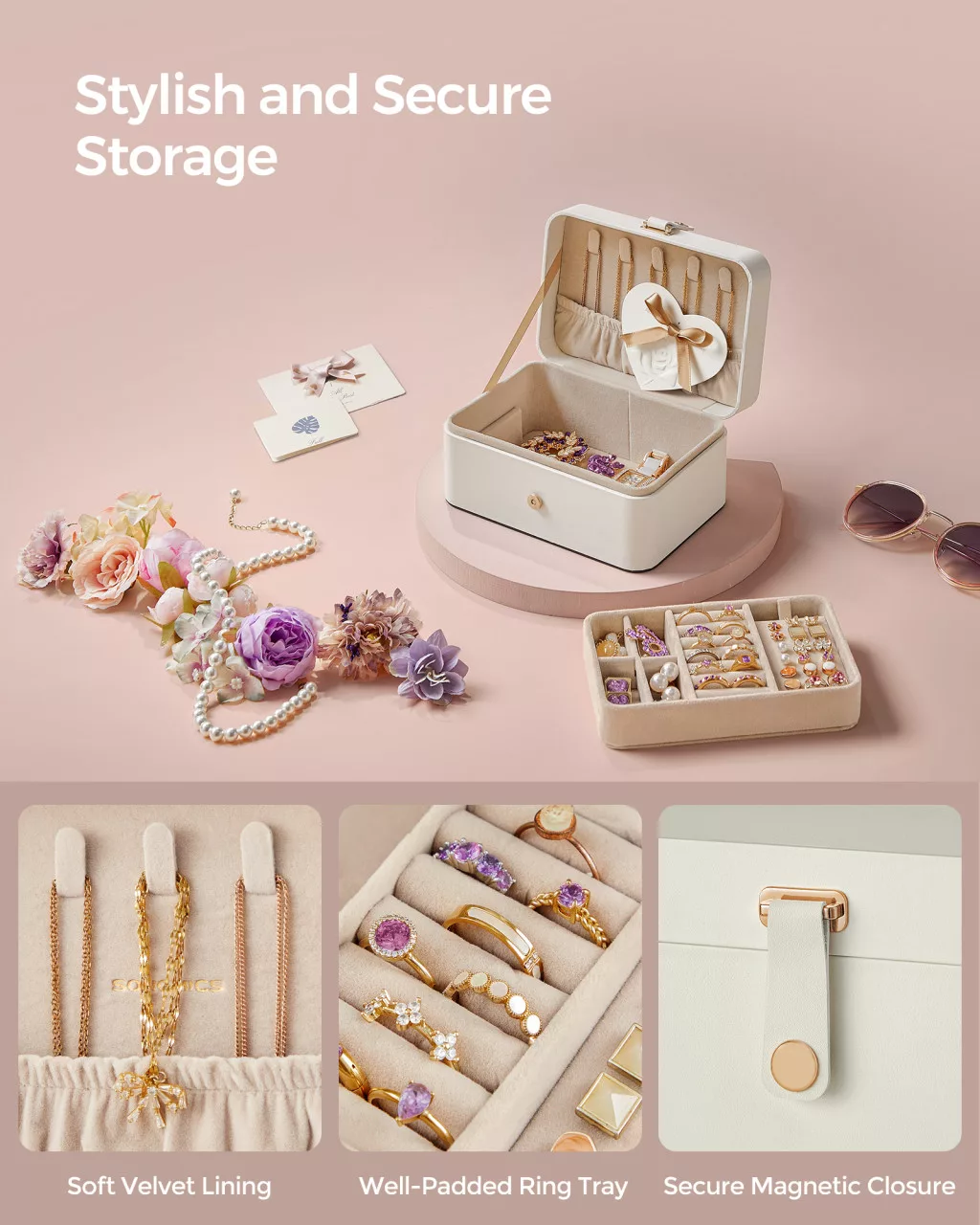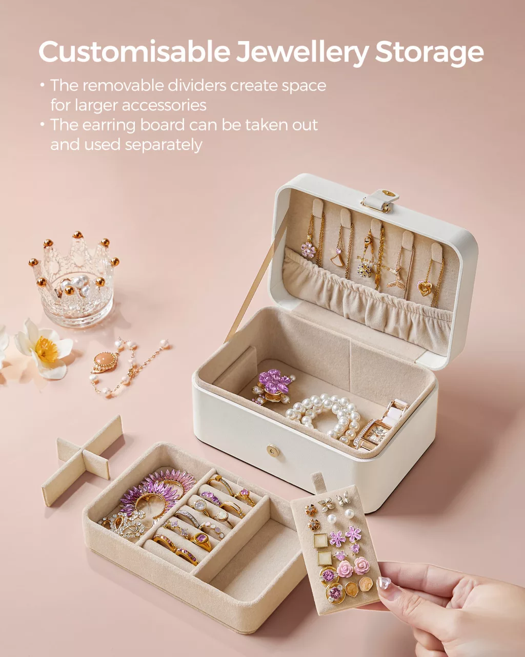 • Kategorizált tárolás: Az ékszertartó fedelén 5 nyaklánc akasztó található, valamint egy eltávolítható ékszertálca fülbevalóknak és gyűrűknek.