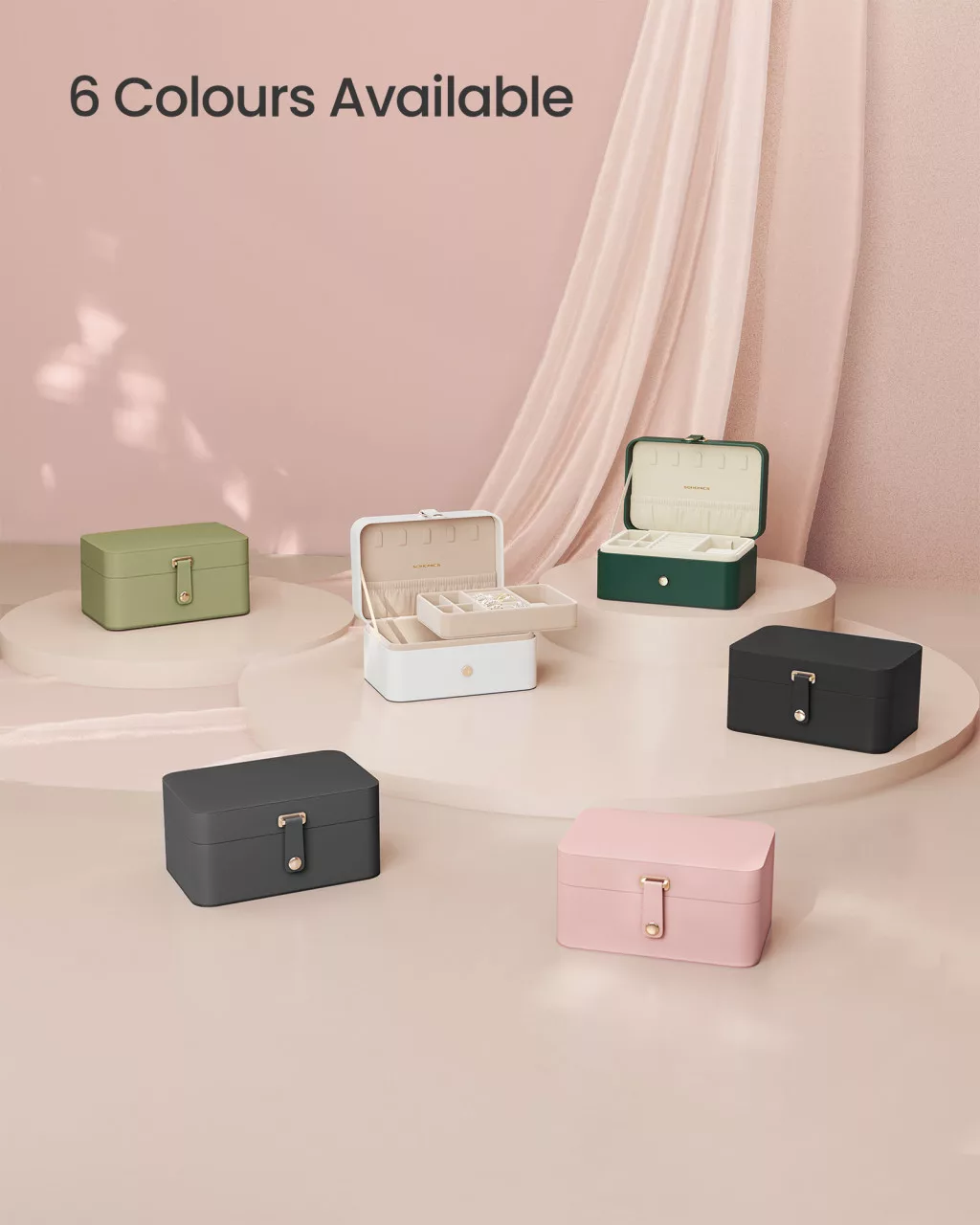 A doboz 2 szinten kínál bőséges tárolóhelyet, így könnyedén elhelyezheted benne gyűrűidet, fülbevalóidat, nyakláncaidat és karkötőidet. A 5 nyaklánc akasztó segít elkerülni a kuszaságot, míg a tároló tálca külön is használható, így testre szabhatod a tárolási lehetőségeidet.