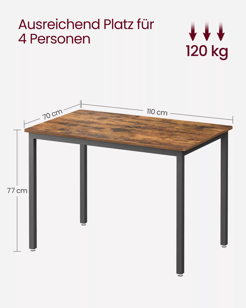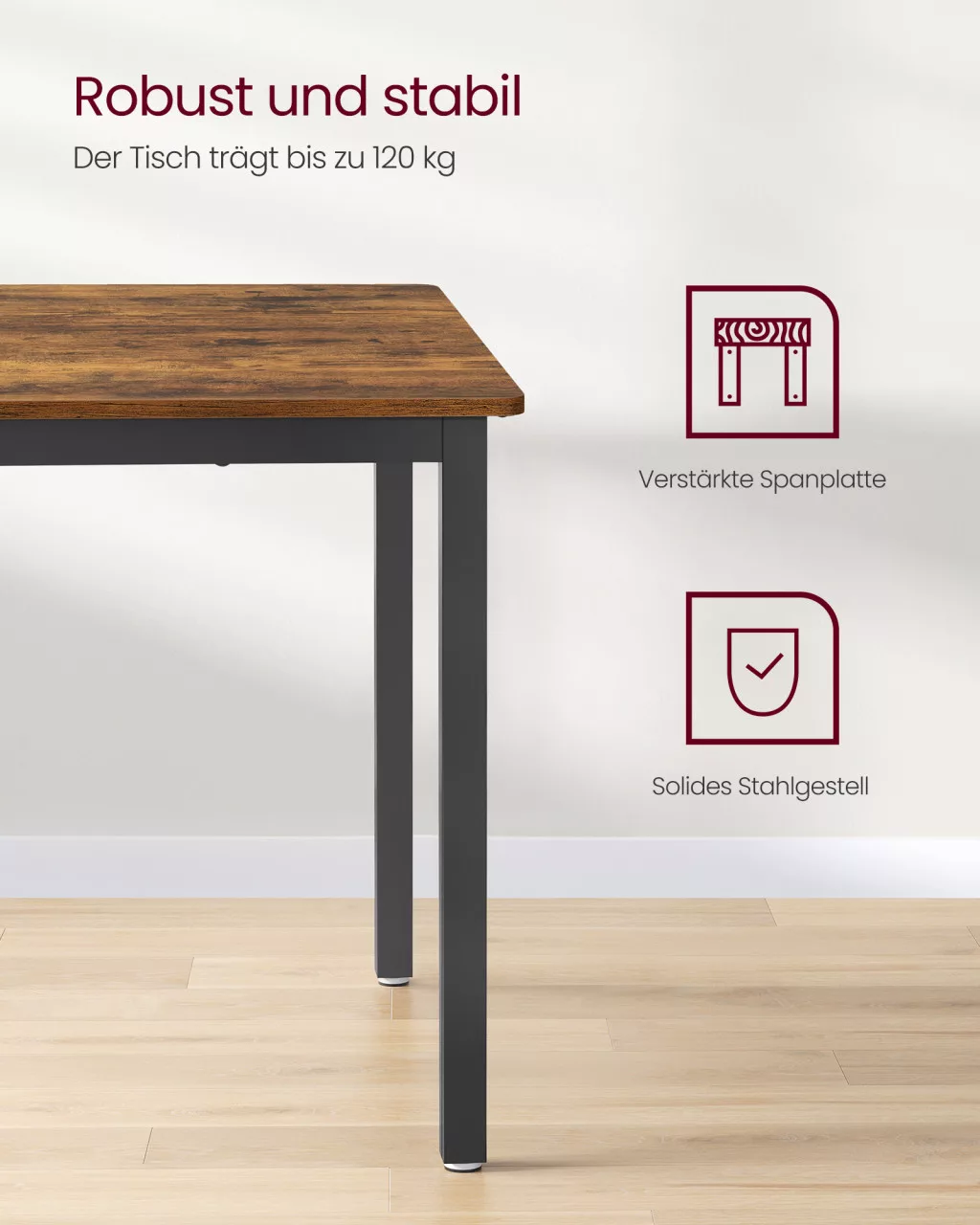 • Ipari stílus: A rusztikus barna asztallap és a fekete acélkeret modern, mégis klasszikus megjelenést biztosít, amely bármilyen belső térbe illeszkedik.