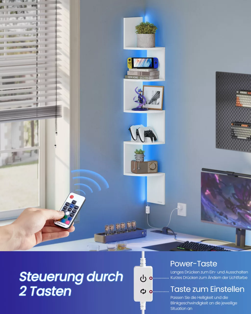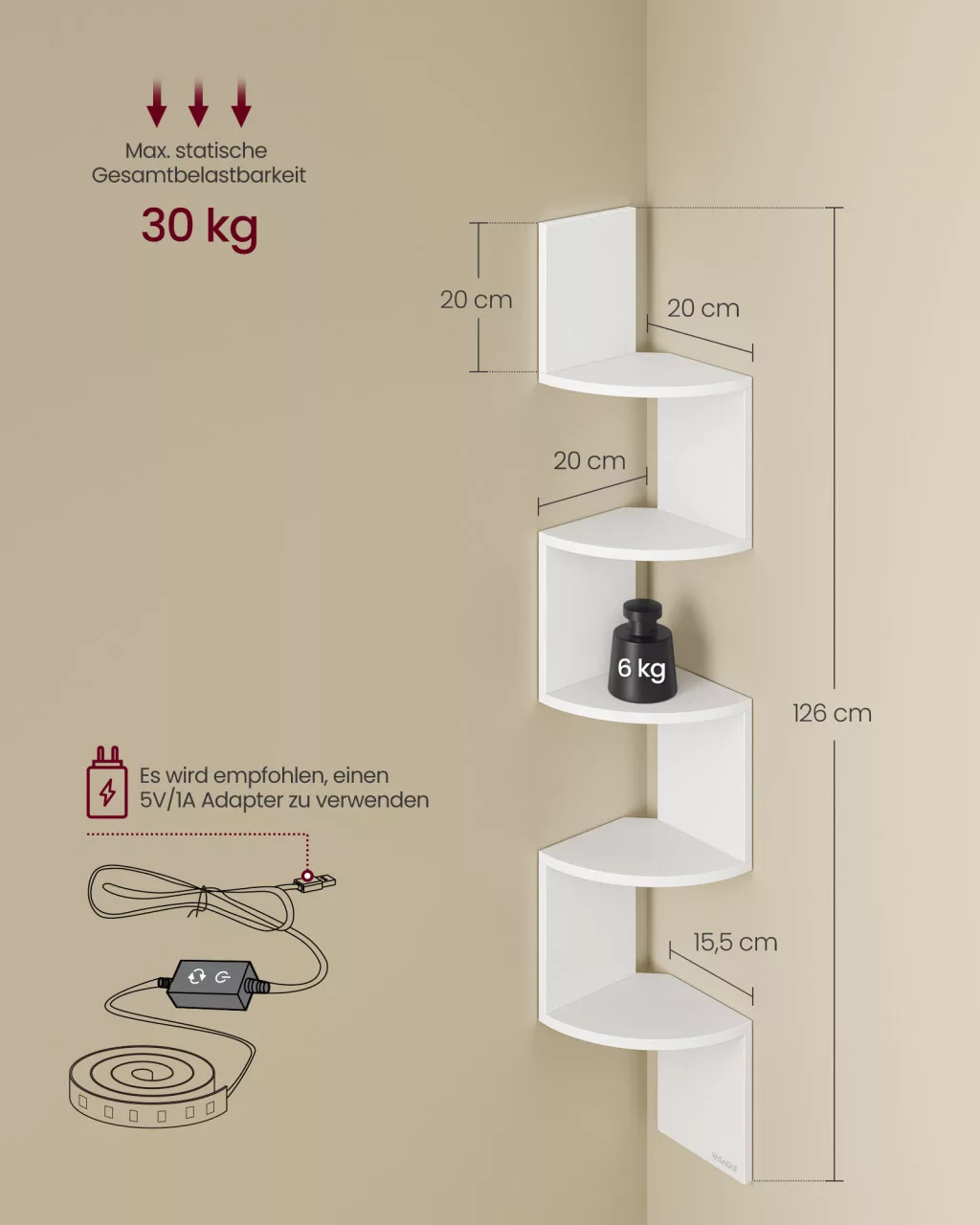 Fedezze fel otthona új dimenzióját a fali sarokpolcunkkal, amely RGB LED világítással van felszerelve! Ez a 5 szintes, matt fehér polc nemcsak praktikus tárolási megoldás, hanem stílusos díszítőelem is, amely bármilyen helyiségben megállja a helyét.