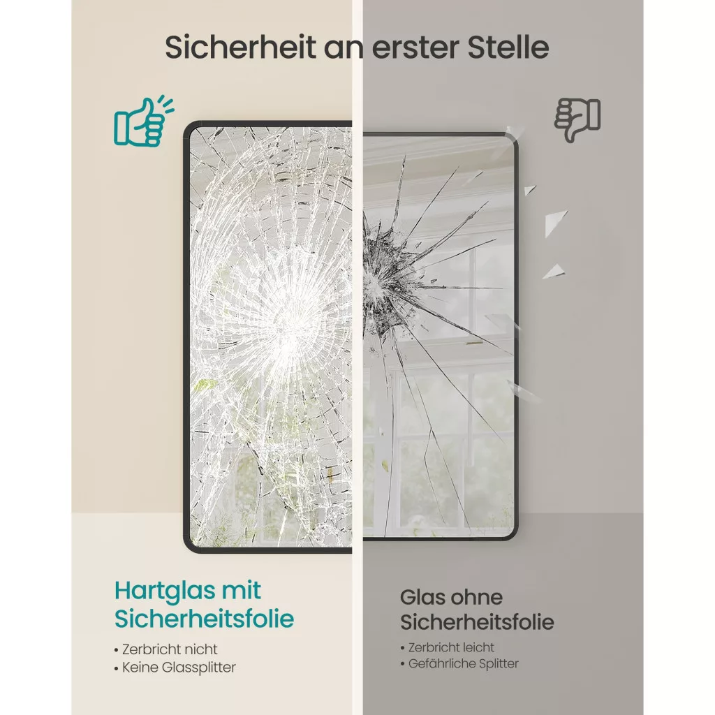 • Biztonságos használat: A magas szilárdságú edzett üveg és a biztonsági fólia minimalizálja a törés kockázatát.