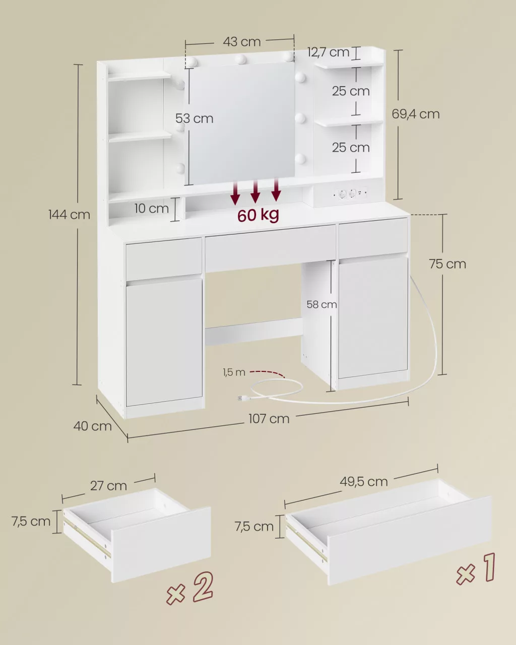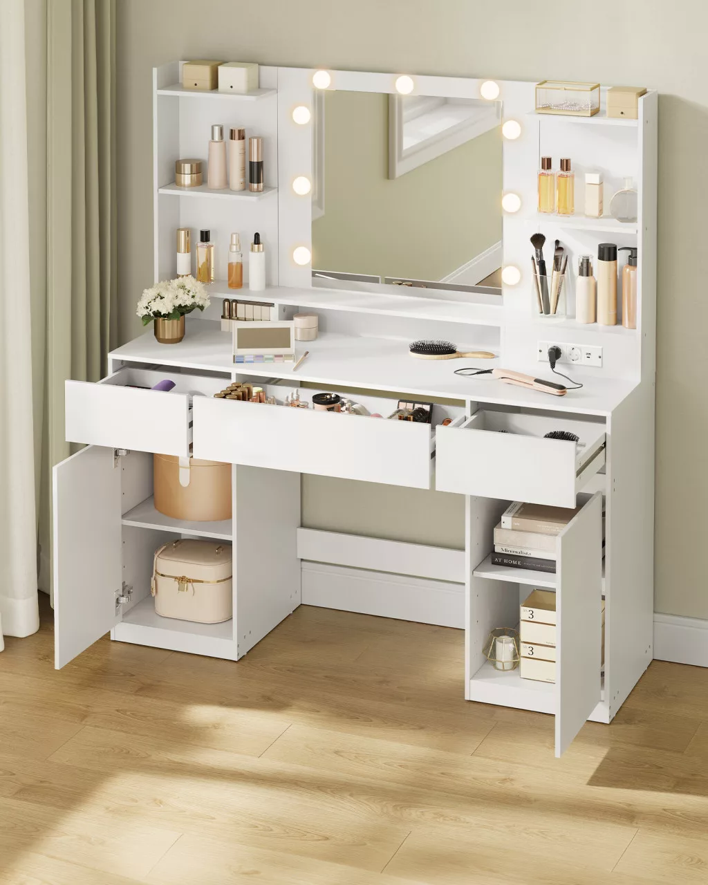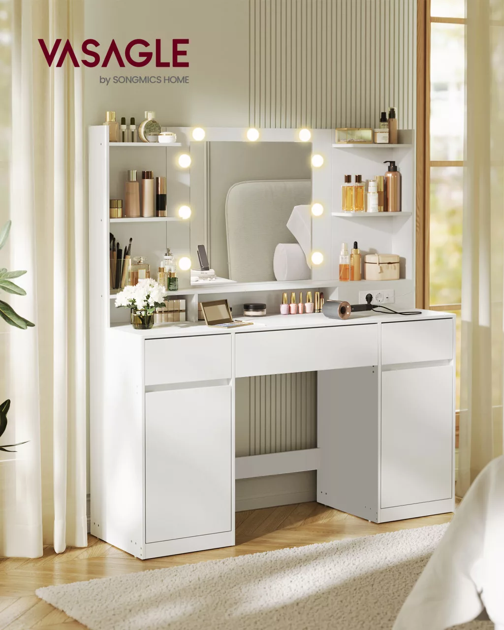 • Elég tárolóhely: A 42 hüvelyk széles asztallap, 3 fiók, 2 szekrény (állítható polccal) és 8 nyitott rekesz elegendő helyet biztosít szépségápolási termékeinek.