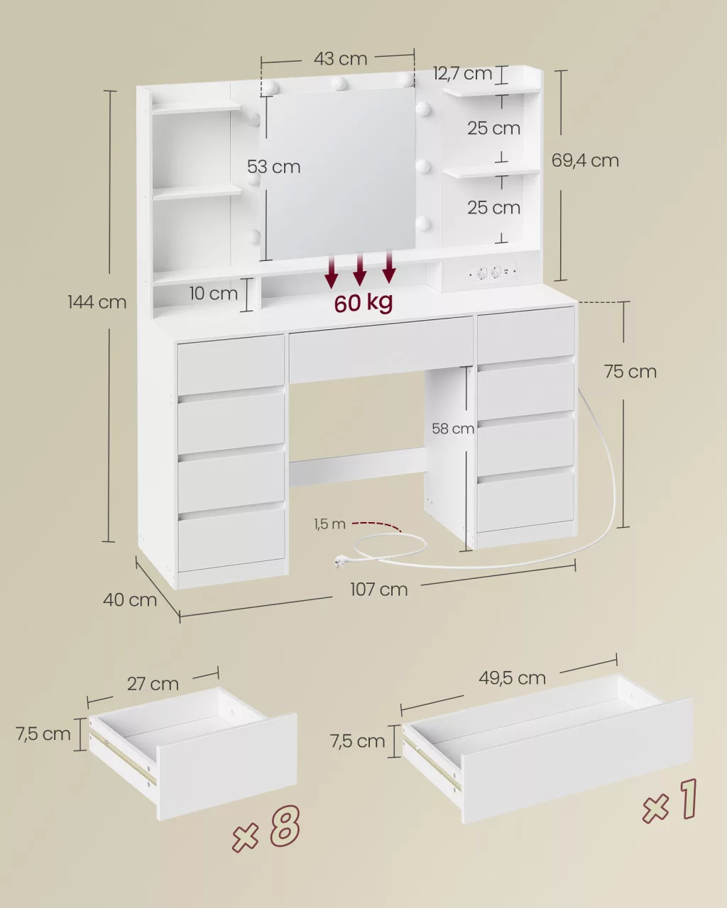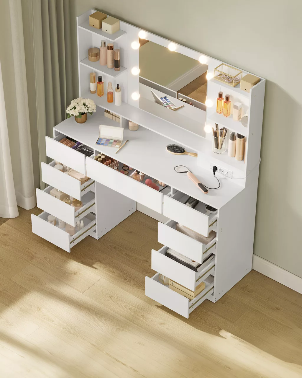 • Praktikus tárolás: A 107 cm széles asztallap, 9 fiók és 8 nyitott rekesz bőséges helyet biztosít a szépségápolási termékek számára.
