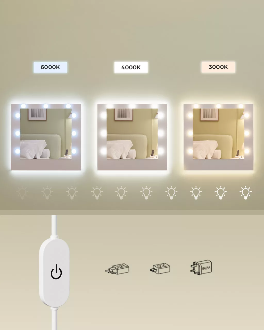 • LED világítás: A tükör körüli 9 izzó 3 különböző színhőmérsékletet kínál, így mindig a megfelelő fényviszonyok között készítheti el sminkjét.