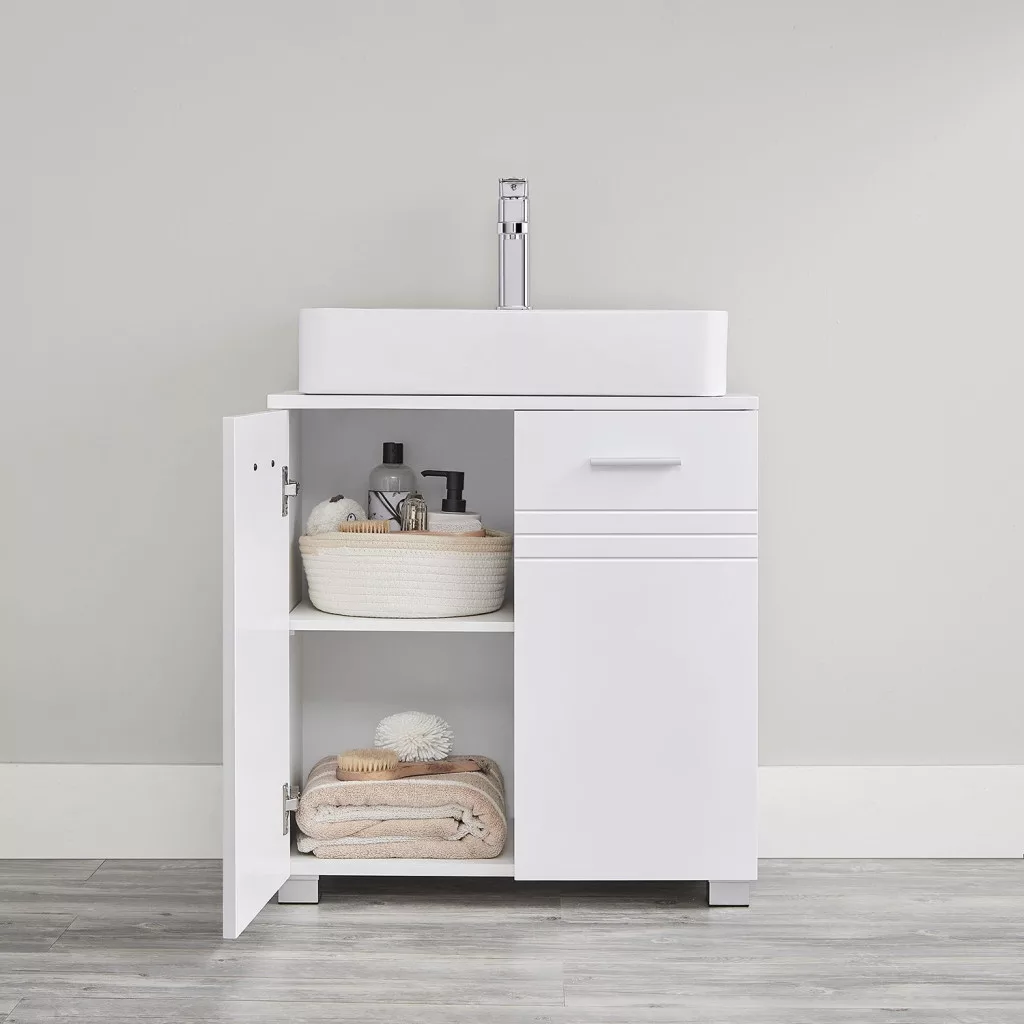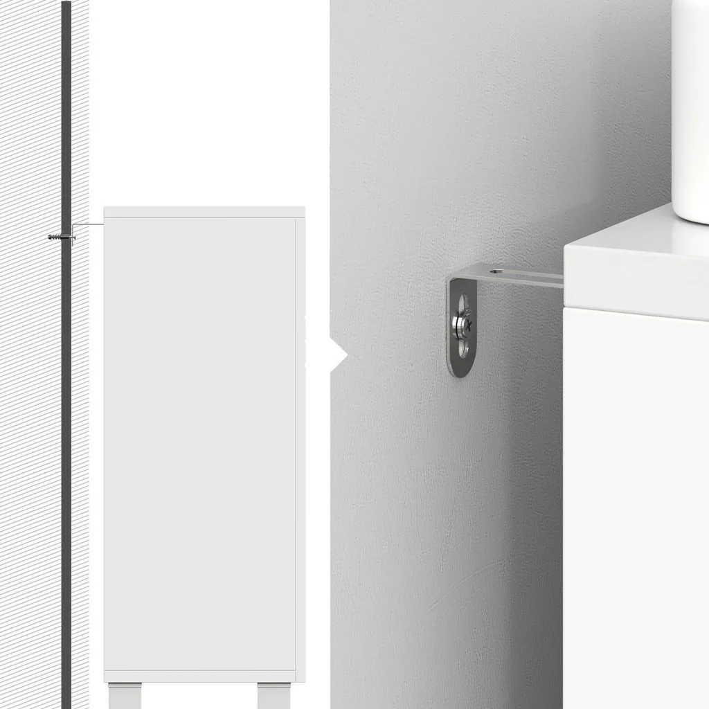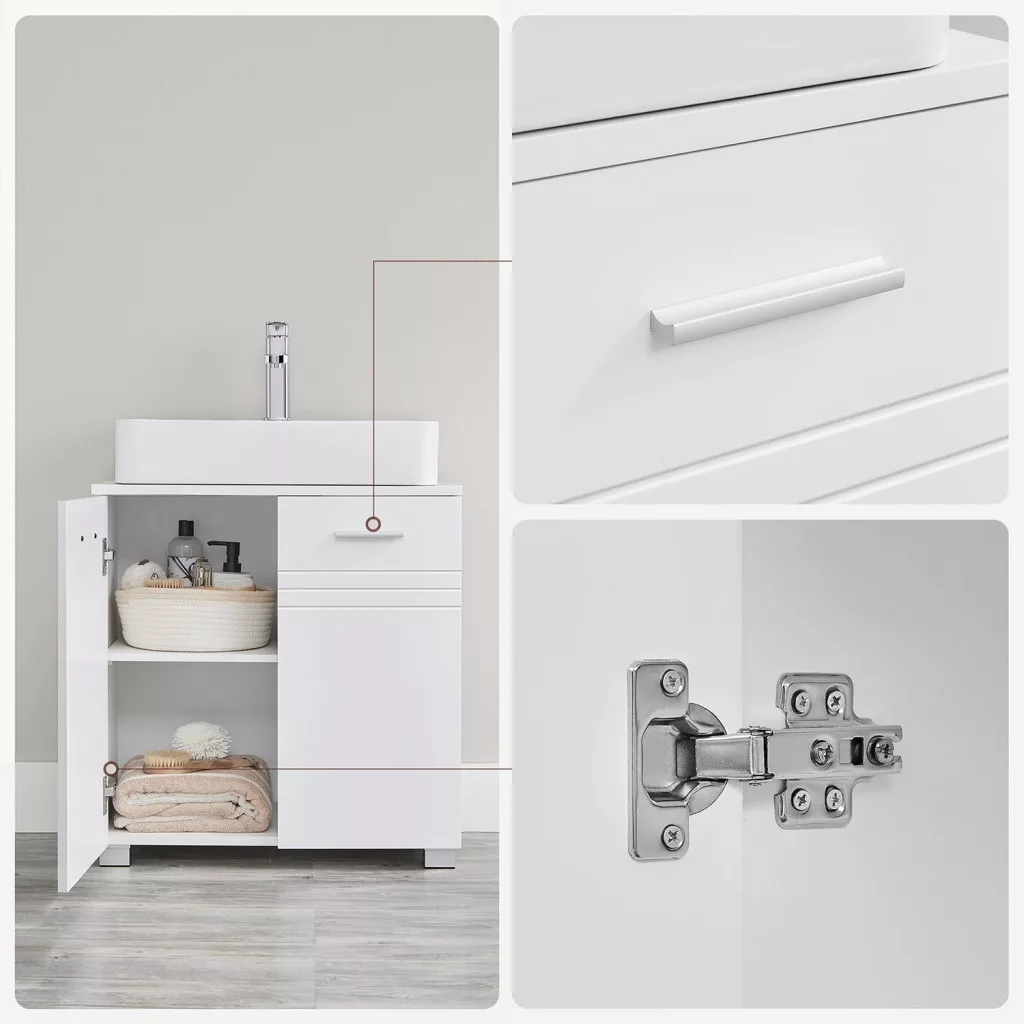 Felejtsd el a fürdőszobai rendetlenséget ezzel a praktikus és stílusos fürdőszoba szekrénnyel! Az állítható polcának köszönhetően könnyedén elhelyezheted a higiéniai termékeidet, míg a tágas felület ideális a napi szükségleteidhez. A U-alakú kivágás (20 x 15 cm) lehetővé teszi a könnyű hozzáférést a mosdóhoz, így minden szükséges dolog kéznél van.