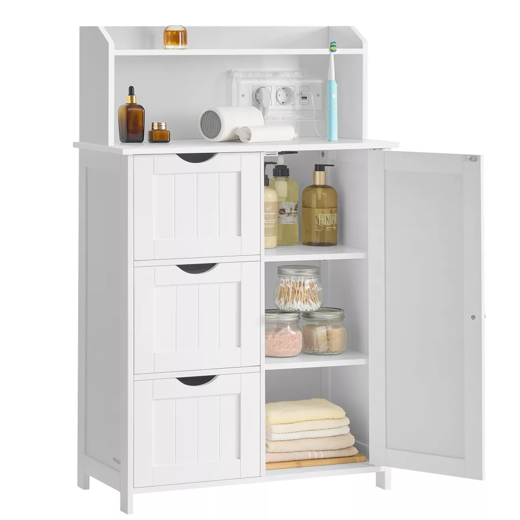 • Kényelmes tárolási lehetőségek: A szekrény felső polcán elhelyezheti a virágcserépét vagy telefonját, míg a középső rekeszben könnyen hozzáférhet a piperecikkekhez. Az alsó szekrény és fiókok pedig lehetővé teszik a toalettpapír diszkrét tárolását.