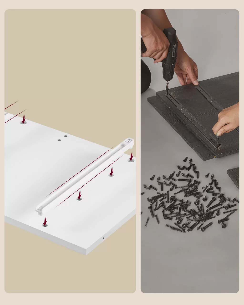 • Könnyű összeszerelés: A világos utasítások, a megjelölt alkatrészek és a szerszám nélküli fiókcsúszkák lehetővé teszik, hogy a szekrényt pillanatok alatt összeszerelje.
