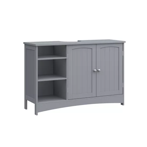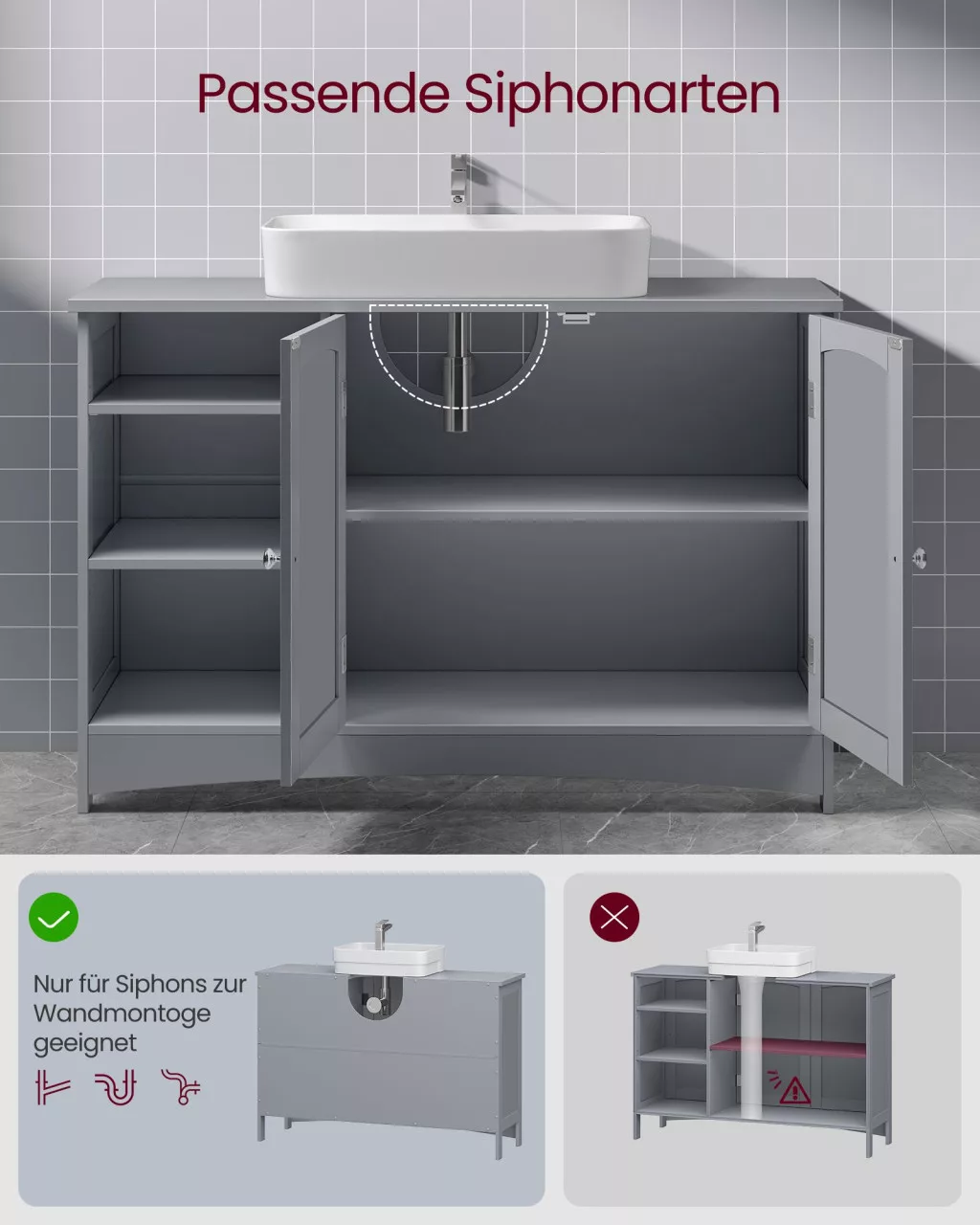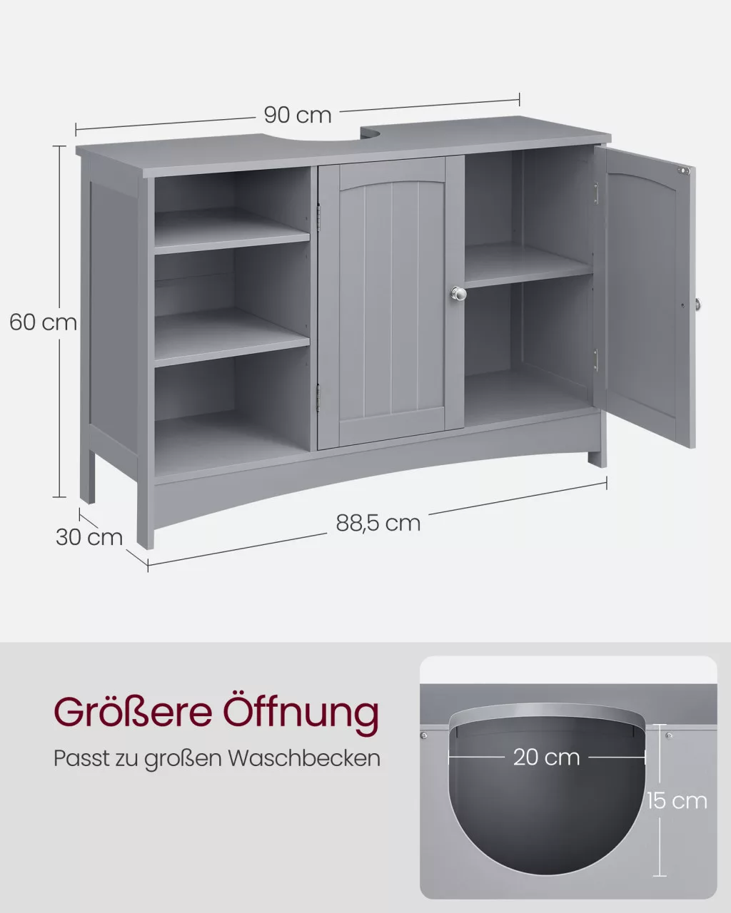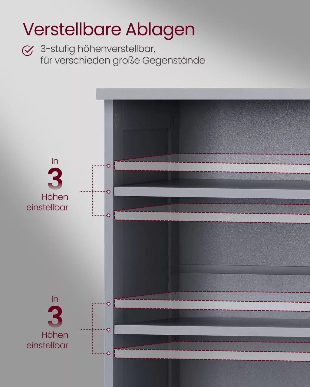 Ha zárt tárolóhelyre van szüksége, nézzen jobbra! Itt egy kétajtós rekesz található, amely 3 magasságban állítható polccal rendelkezik. Itt elhelyezheti a tartalék törölközőket és vécépapírt.