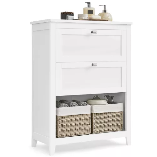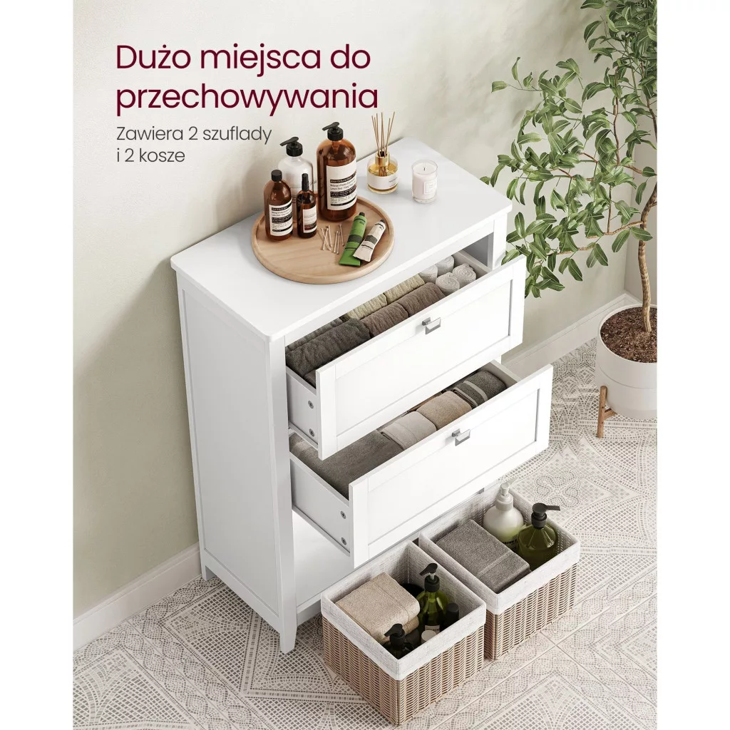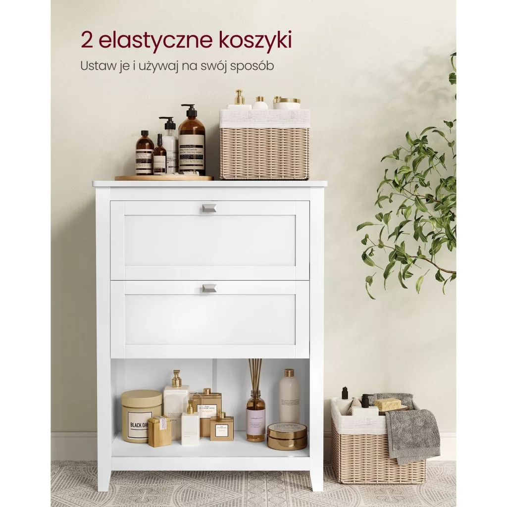 [Sokoldalú tárolás] 1 polccal, 2 tágas fiókkal, 1 nyitott rekesszel és 2 szintetikus rattan kosárral ez a 30 x 60 x 80 cm-es fürdőszobaszekrény bőséges és sokoldalú helyet biztosít a különféle rendszerezési igények kielégítésére. [Állítható elválasztókkal] A tárolószekrény állítható elválasztókat tartalmaz, amelyek bármelyik fiókban használhatók, így a teret a saját ízlése szerint alakíthatja ki, hogy különböző méretű tárgyakat is elférjenek benne. [2 rugalmas rekesz] A 2 szintetikus rattan kosár segít a tárgyak rendszerezésében. Kiveheti őket, hogy bárhol és bármikor használhassa őket. [Masszív, stabil és biztonságos] A padlószekrény festett MDF paneljei masszívak és könnyen tisztíthatók a hosszú távú használat érdekében. A borulásgátló készlet segít a szekrény falhoz rögzítésében a fokozott biztonság érdekében. A lekerekített felső sarkok megakadályozzák a véletlen ütődéseket. [Egyszerű és stílusos] Letisztult vonalak, gyémánt alakú gombok, szintetikus rattan kosarak, kúpos lábak... ezek az elemek harmóniában működnek együtt, hogy létrehozzák ezt a szekrényt, amely friss, természetes hatást kölcsönöz fürdőszobájának.