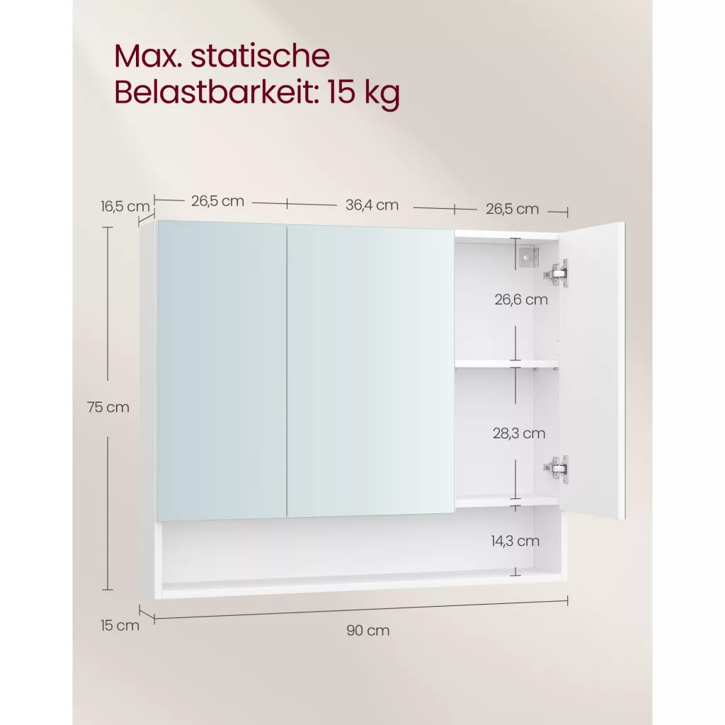 A fürdőszoba tükörszekrény MDF és forgácslap anyagból készült, így tartós és könnyen karbantartható. A termék méretei 16.5 cm mélység, 90 cm szélesség és 75 cm magasság, míg a maximális statikus terhelhetősége 15 kg. A csomag tartalmaz egy tükörszekrényt, egy összeszerelő készletet és egy használati útmutatót.