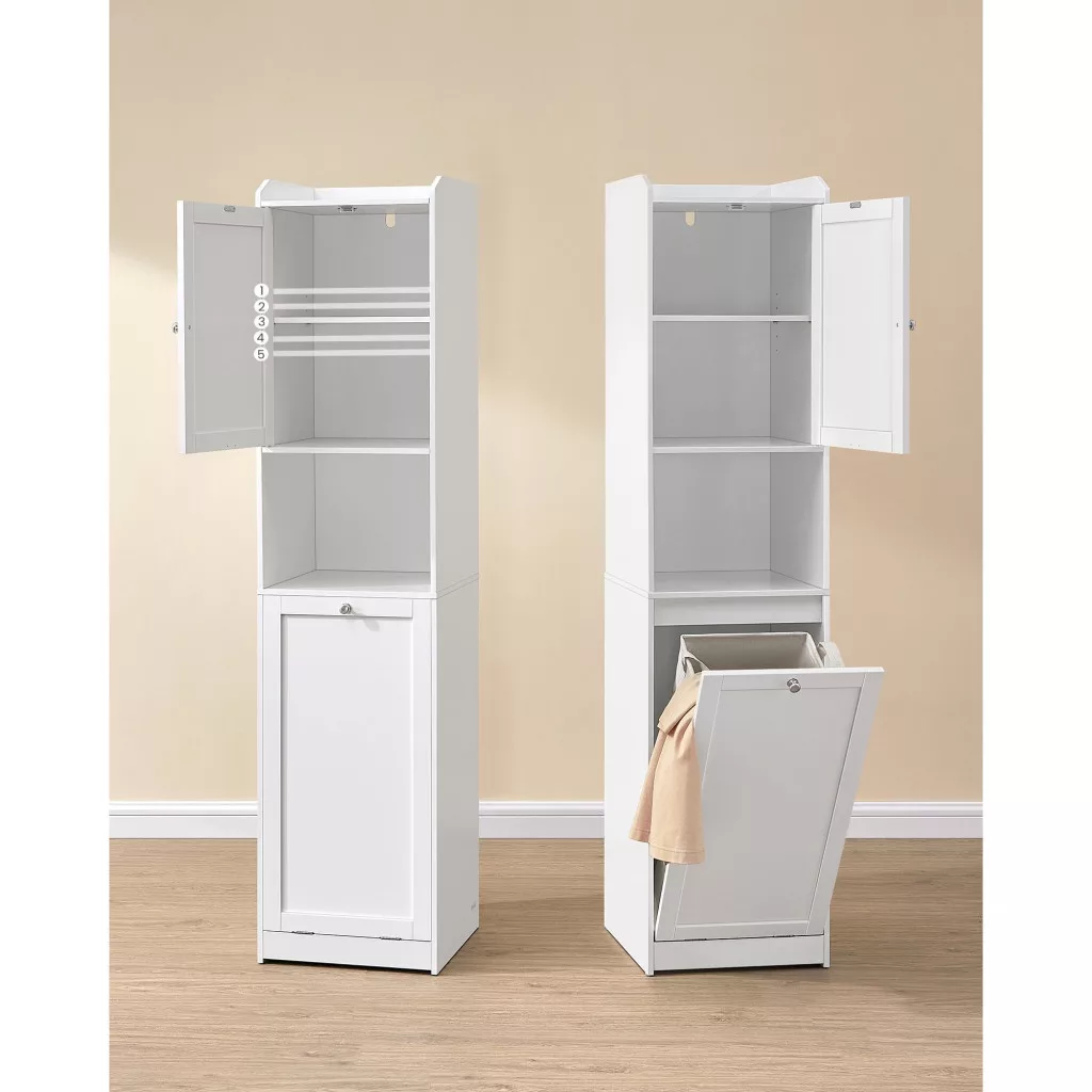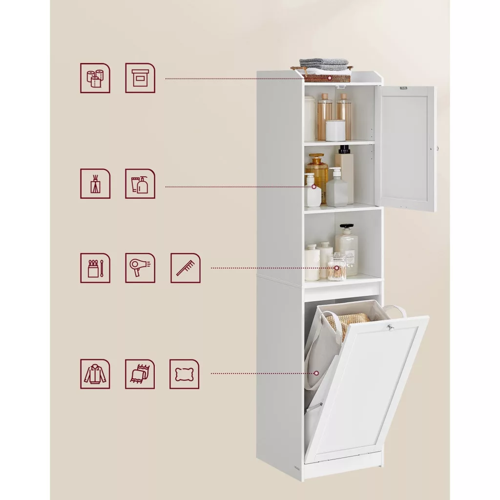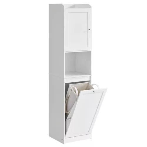 A fürdőszobai torony szekrény, mosókosárral, felhőfehér színben egy tökéletes megoldás a fürdőszobai tárolásra. Ez a praktikus bútor nemcsak esztétikus, hanem rendkívül funkcionális is. Az alábbi előnyöket kínálja a vásárlók számára: