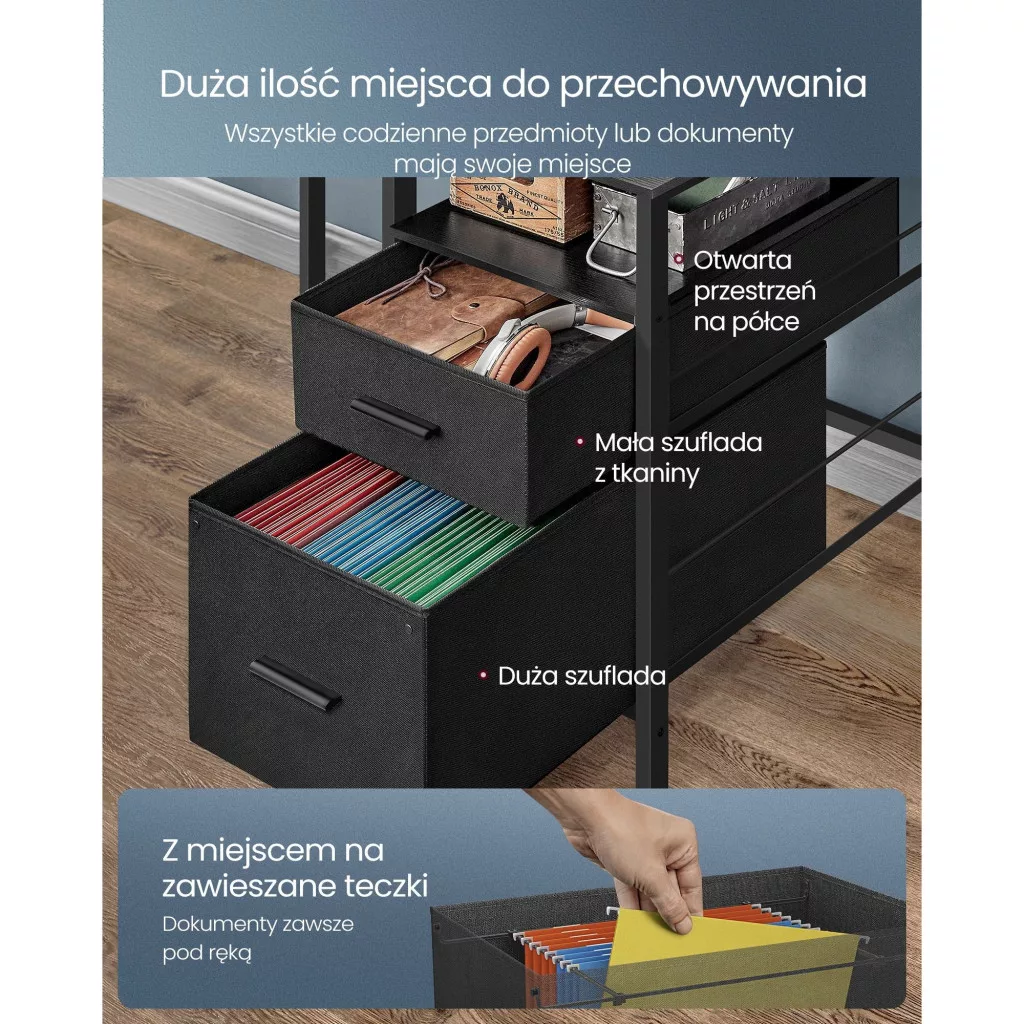 • Tágas tárolás: Az asztal nyitott rekesszel, fiókkal és akasztós mappatartóval rendelkezik, így minden szükséges eszköz könnyen elérhető.