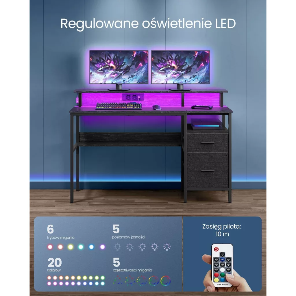 Íróasztal szövet fiókokkal, monitor állvánnyal, LED világítással, 135 x 55 x 90