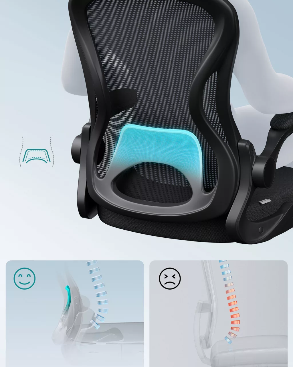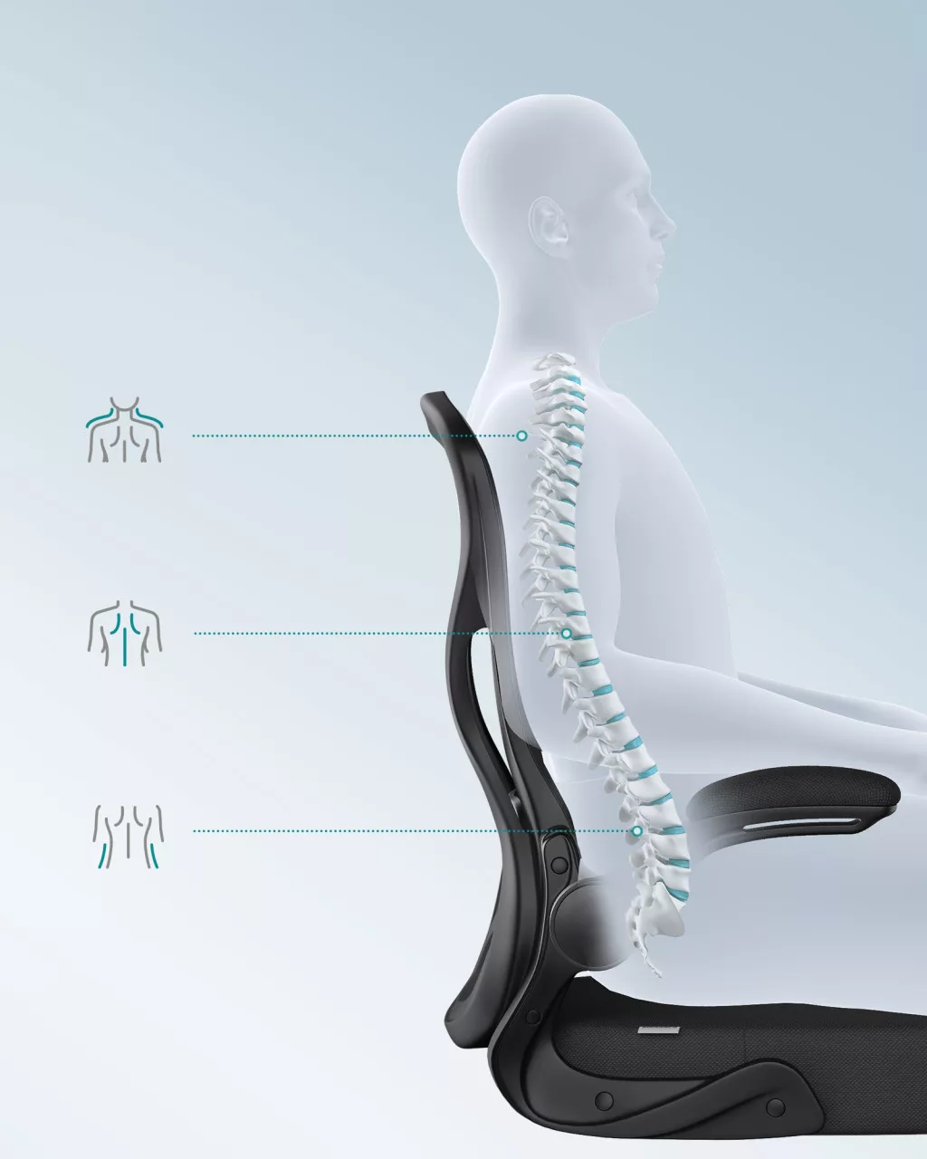 • Ergonomikus kialakítás: A háttámla tökéletesen alkalmazkodik a testhez, míg a jól párnázott deréktámasz optimálisan támogatja az alsó hátat, hatékonyan megelőzve a hátfájást.