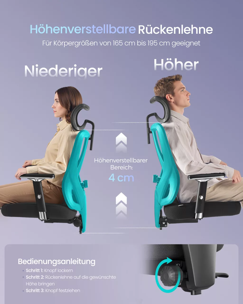 • Állítható támaszok: A szék magassága és a háttámla dőlésszöge 90° és 135° között állítható, így mindig megtalálhatja az ideális ülőpozíciót.