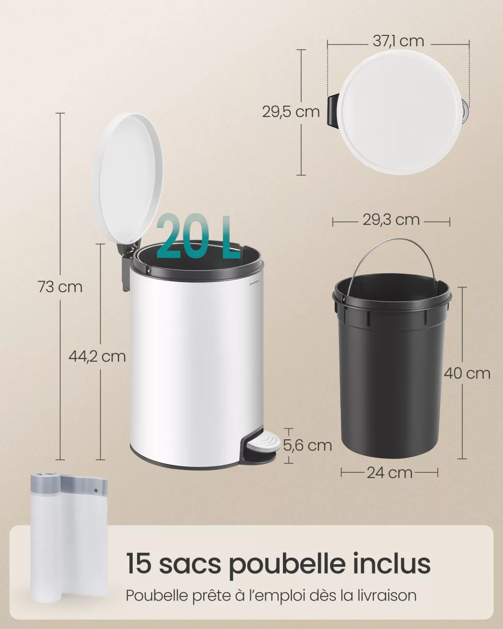 • Kész a használatra: A termékhez 15 db tökéletesen illeszkedő szemeteszsák is jár, így azonnal használatba vehető.
