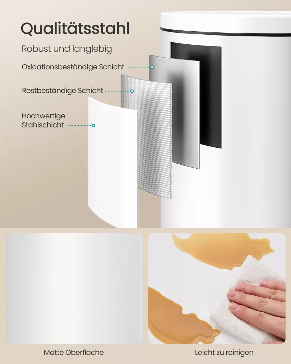 • Csendes & higiénikus: A lágy záródású fedél megakadályozza a csapódást, míg a belső vödör és fogantyú segít a könnyű és higiénikus kiürítésben.