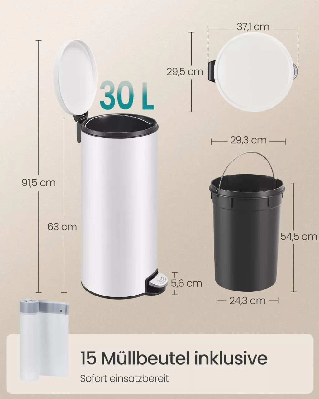 • Kész használatra: A termék 15 tökéletesen illeszkedő szemeteszsákot tartalmaz, így azonnal használatba vehető.