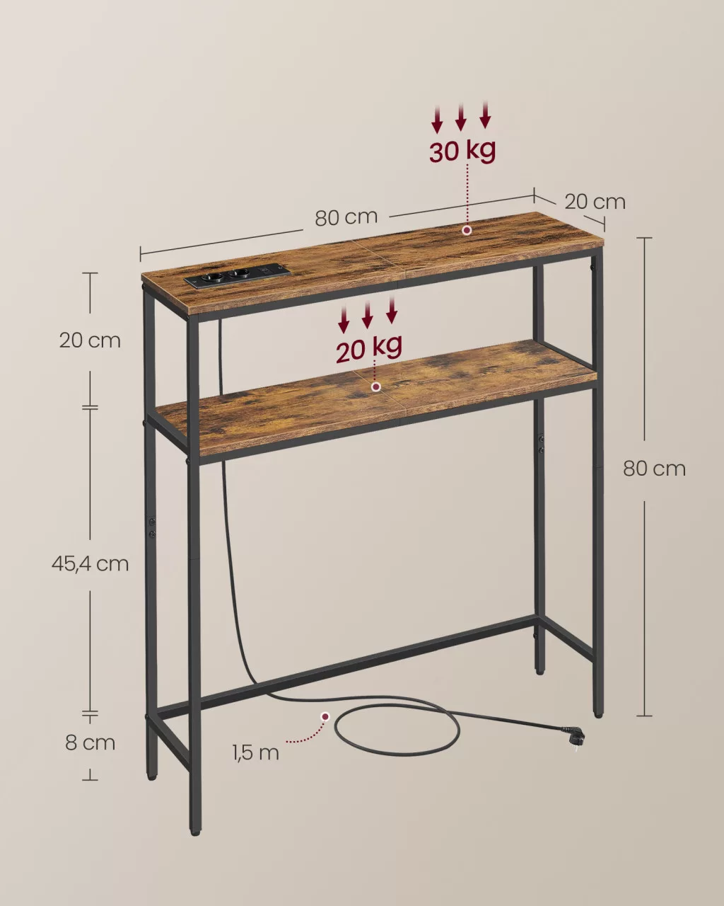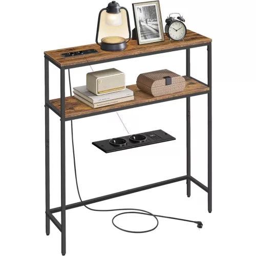 Keskeny konzolasztal 2 polccal, beépített töltővel, rusztikus barna