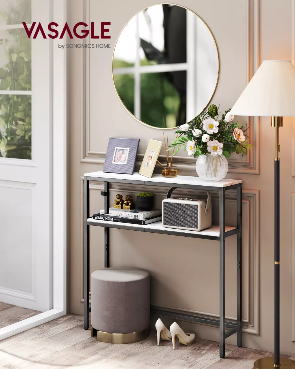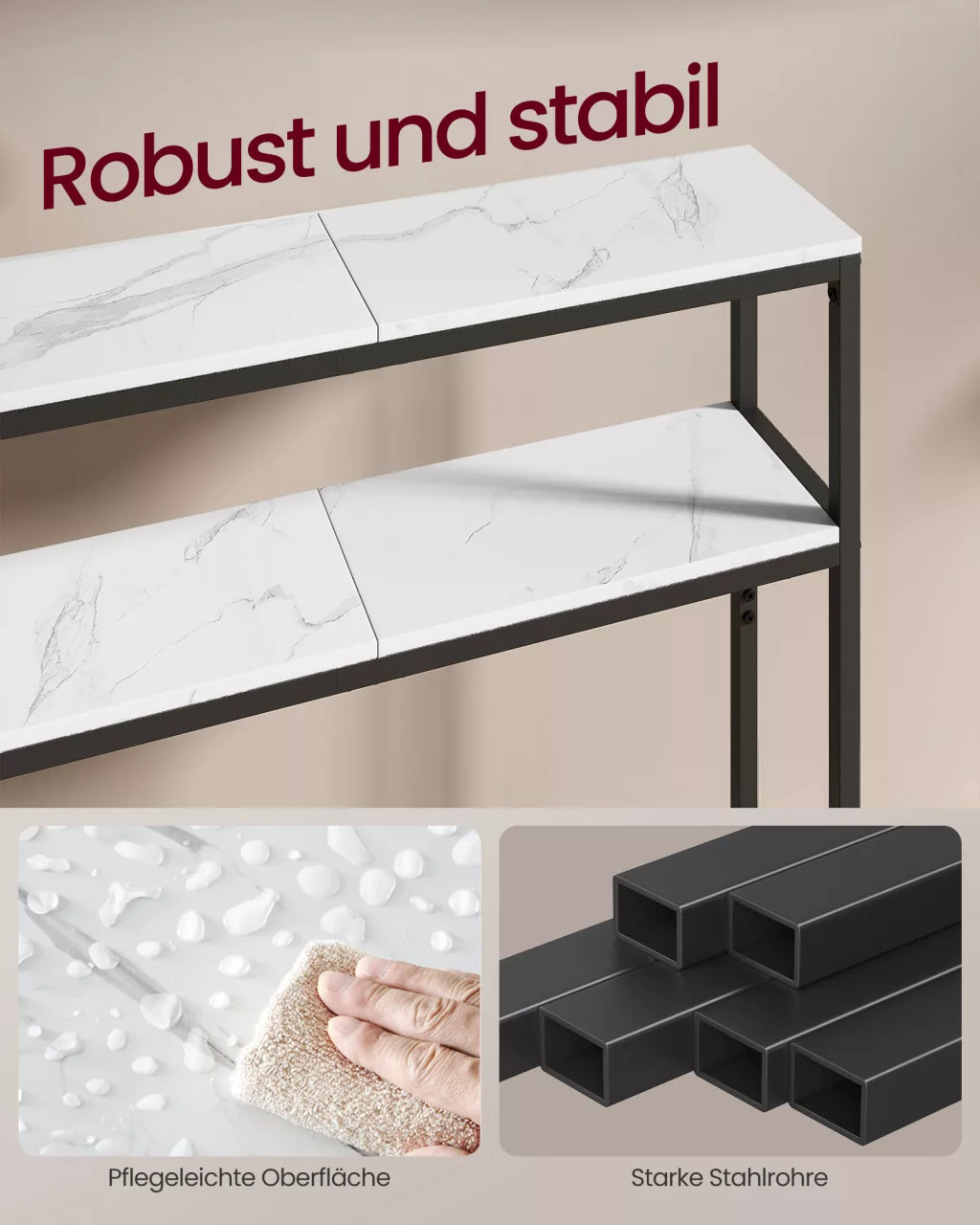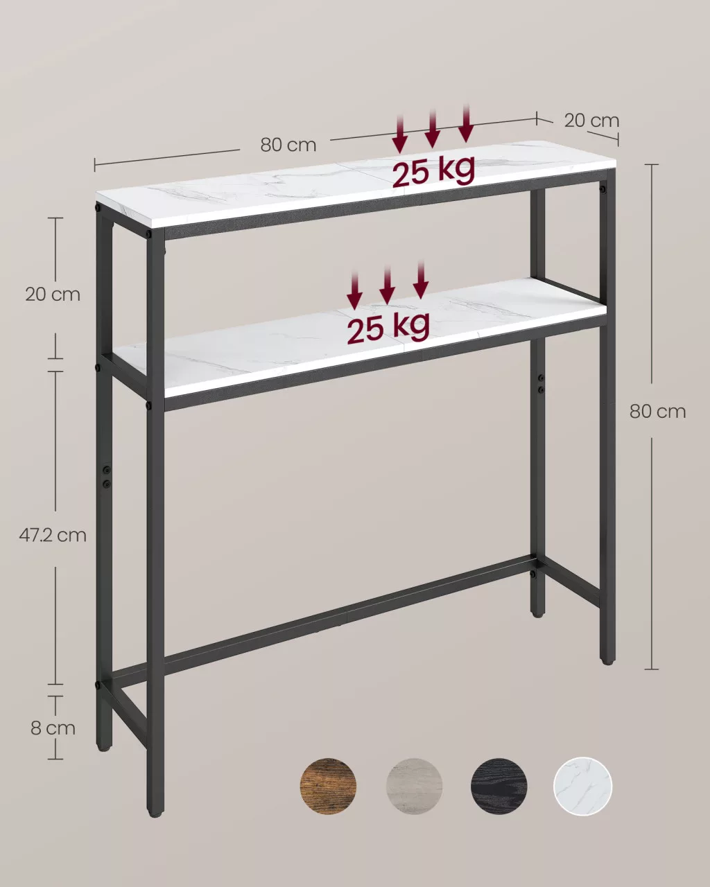 • Kompakt és tágas: A 20 x 80 x 80 cm-es méretének köszönhetően ez a keskeny konzolasztal tökéletesen illeszkedik a kisebb helyiségekbe is. Két polca bőséges tárolóhelyet biztosít könyvek, virágcserepek és mindennapi használati tárgyak számára.