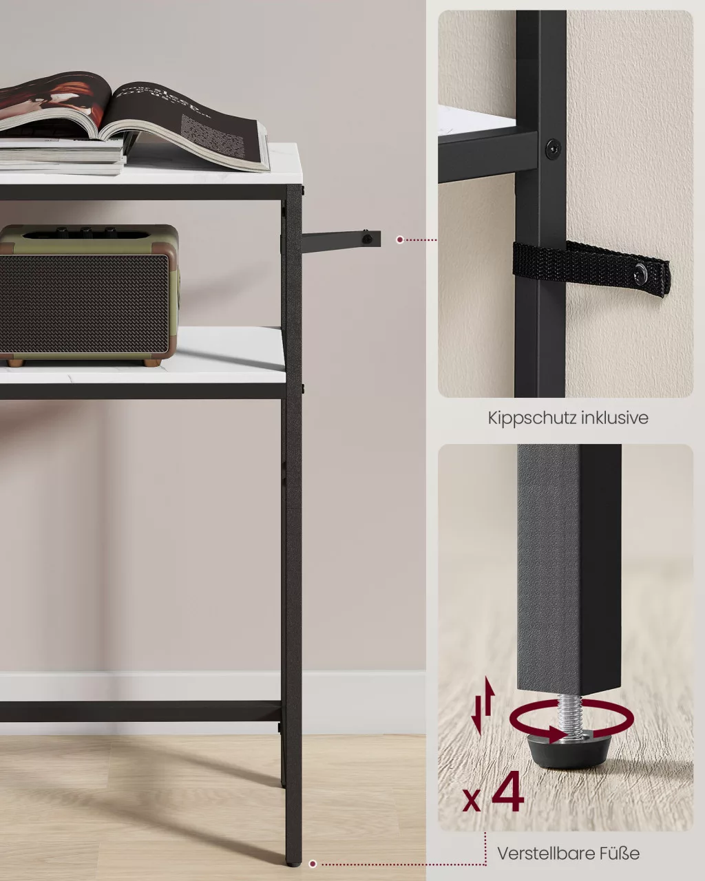 • Erős és stabil: A robusztus forgácslap és acélkeret kombinációja lehetővé teszi, hogy a felső polc akár 30 kg-ot, míg az alsó polc 20 kg-ot is elbírjon. Az állítható lábak biztosítják a stabilitást és megakadályozzák a billegést.