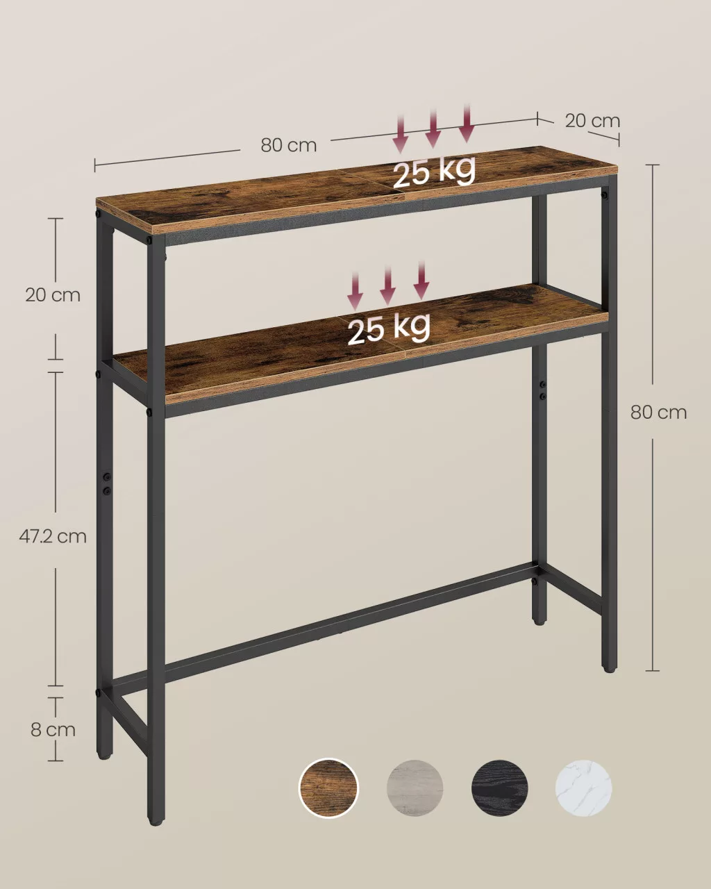 Ez a keskeny konzolasztal ideális választás, ha szeretné feldobni otthona hangulatát. A rusztikus barna szín és a modern dizájn tökéletes kombinációja lehetővé teszi, hogy bármilyen stílusú helyiségbe beilleszthető legyen. Az alsó polc tökéletes hely a könyveknek vagy dekorációs elemeknek, míg a felső polc ideális a kedvenc képeinek vagy növényeinek kiemelésére.