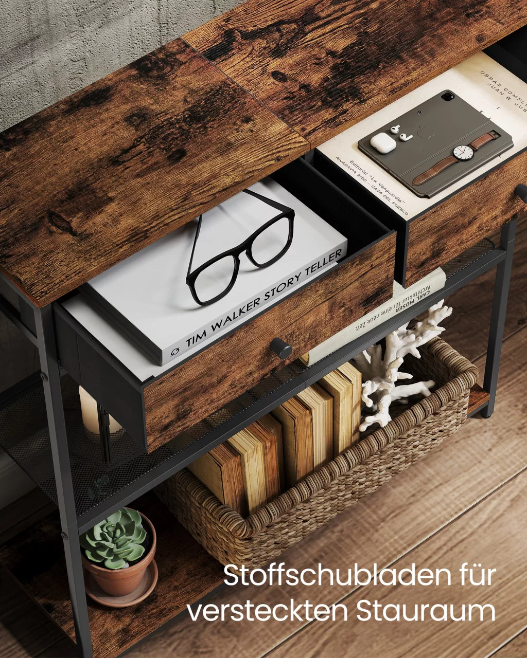 • Bőséges tárolóhely: A konzolasztal egy tágas felső felülettel rendelkezik a gyakran használt tárgyak számára, valamint két szövetfiókkal a kisebb dolgok számára.