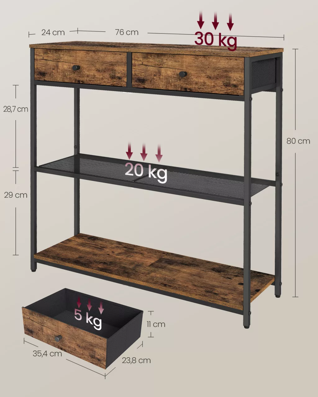 Keskeny konzolasztal 2 szövetfiókkal, rusztikus barna