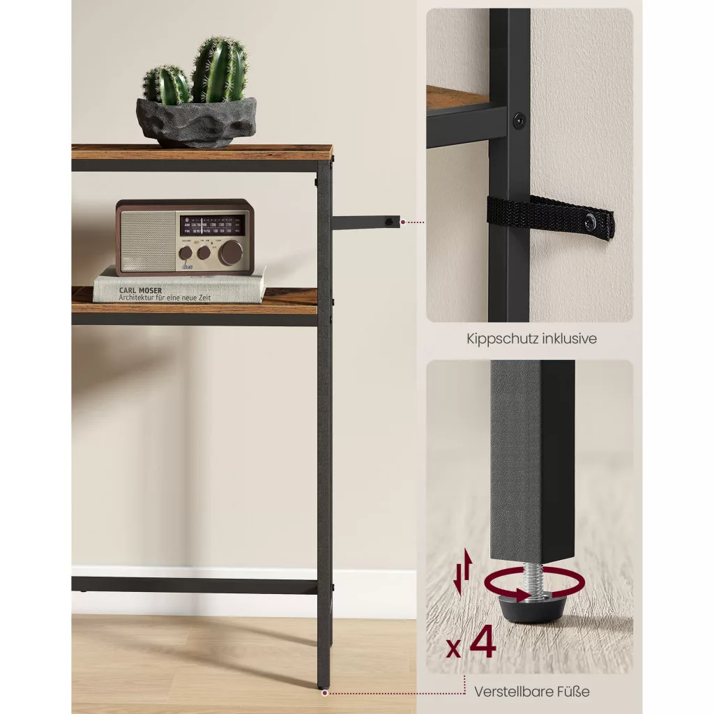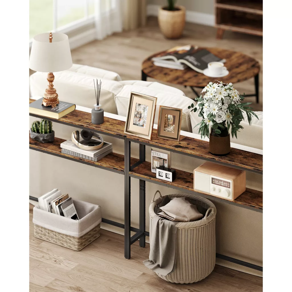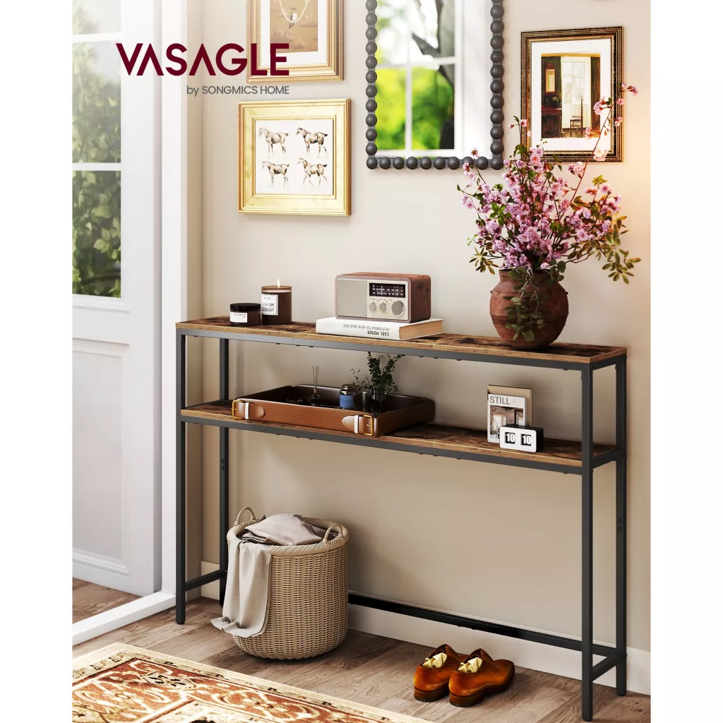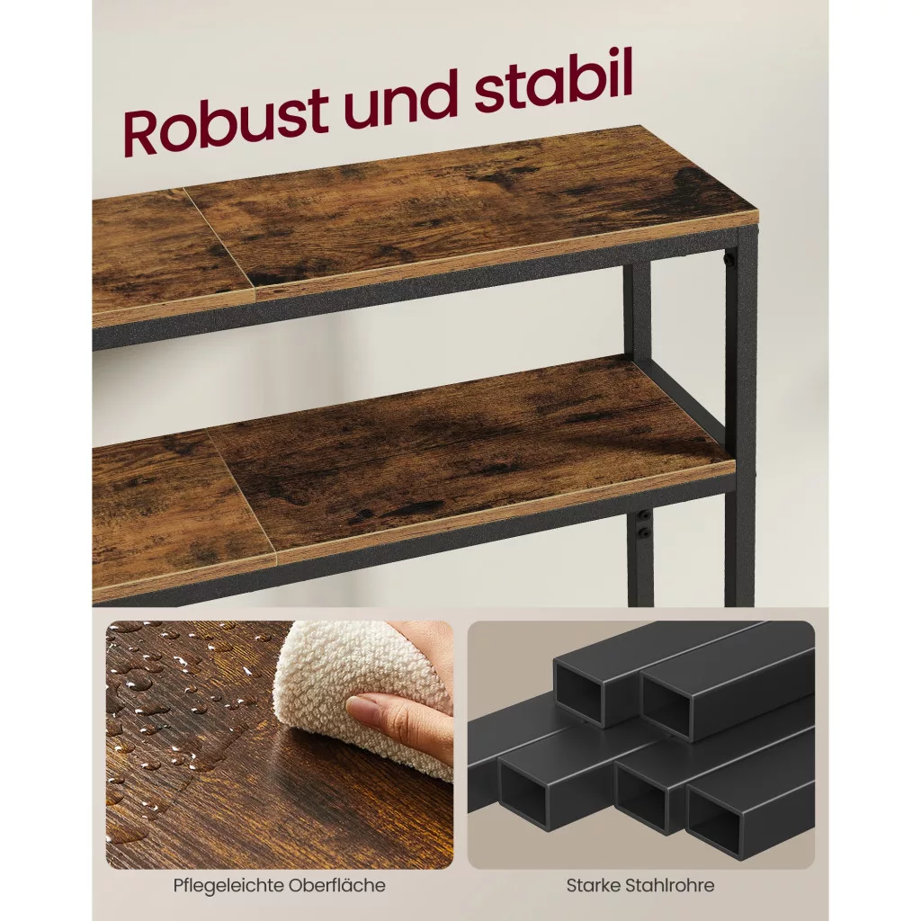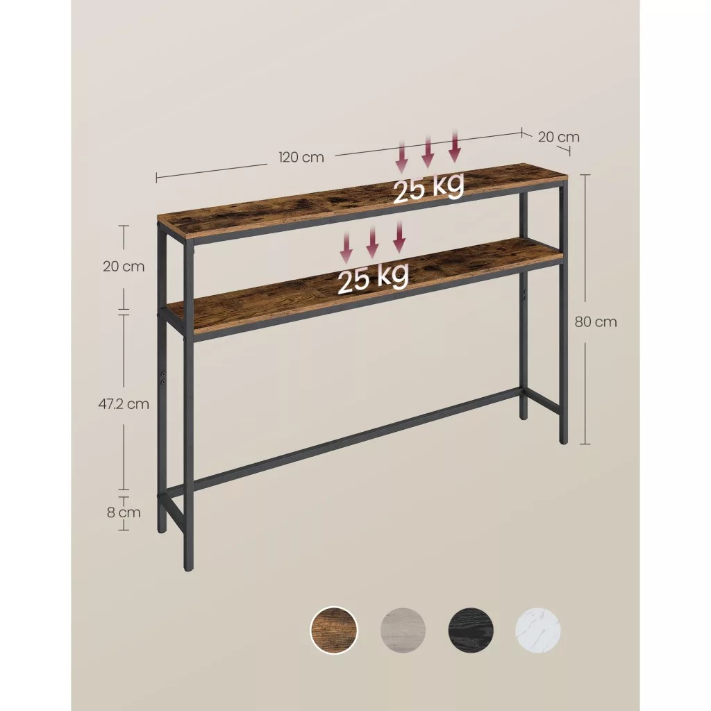 A keskeny konzolasztal két polccal, rusztikus barna és fekete színben, tökéletes választás minden modern otthonba. Az alábbi előnyöket élvezheti, ha ezt a praktikus bútordarabot választja: