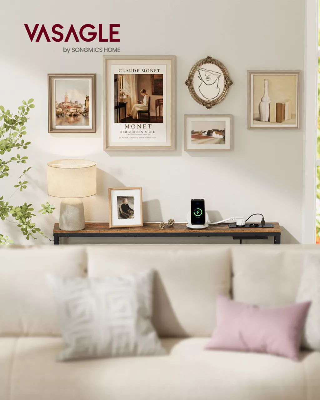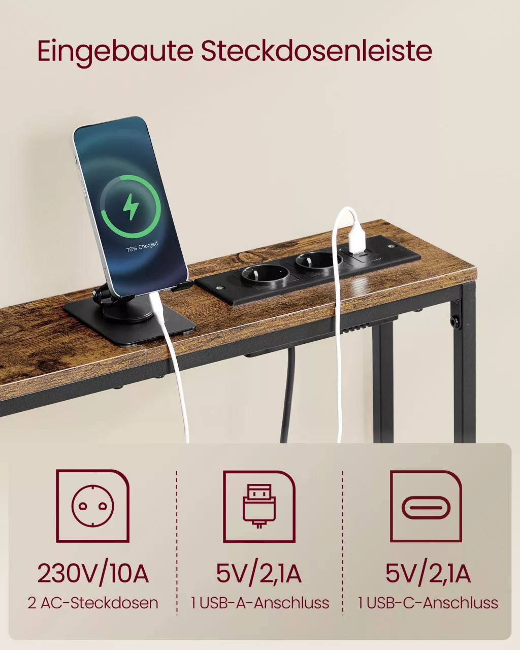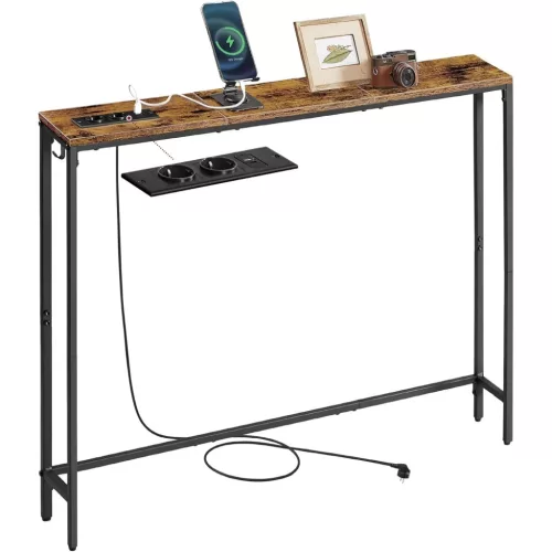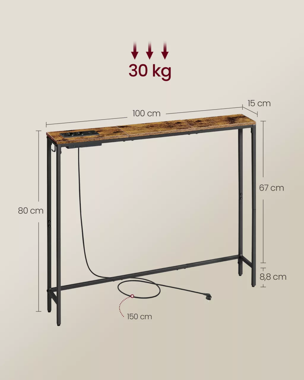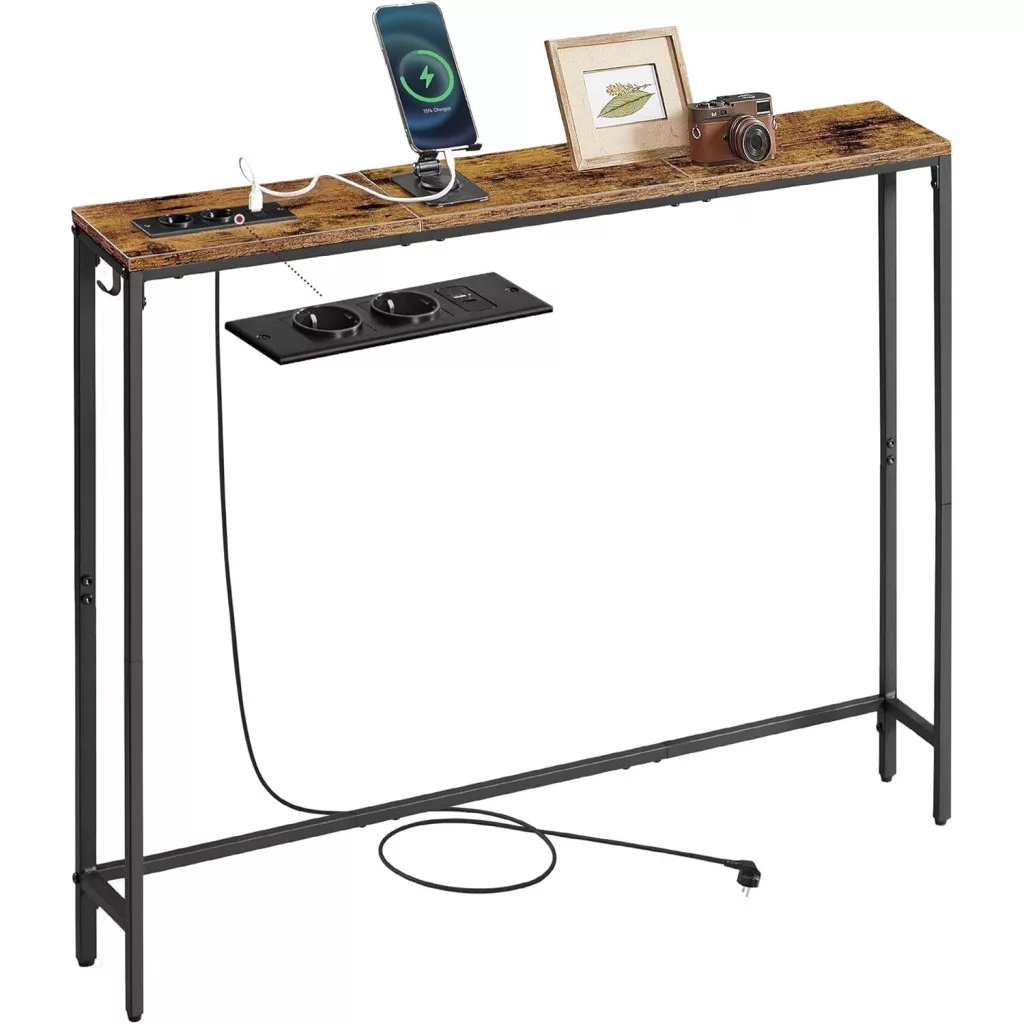 Ez a keskeny konzolasztal töltőállomással és akasztókkal ideális megoldás a modern otthonok számára. A rusztikus barna szín és a minimalista dizájn tökéletesen illeszkedik bármilyen belső térbe, legyen szó nappaliról vagy előszobáról. Az alábbi előnyöket kínálja:
