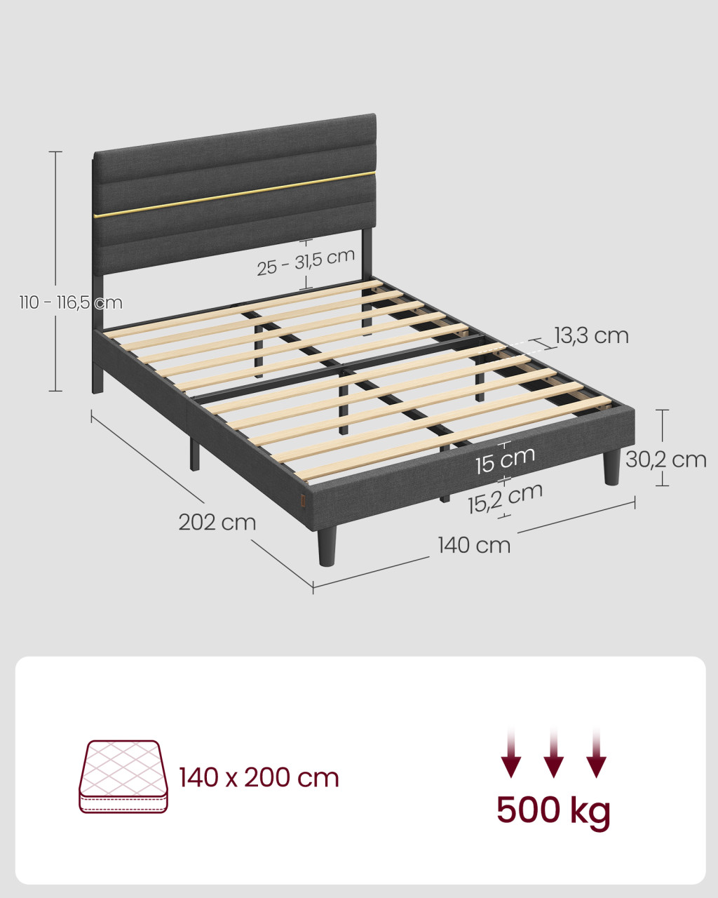 Az ágy színe szürke, ami bármilyen belső térhez illeszkedik. A méretei 202 x 140 x 110/116.5 cm (H x Sz x M), míg a nettó súlya 24.2 kg. A maximális statikus terhelhetősége 500 kg, így biztos lehet benne, hogy ez az ágy hosszú távon is megbízhatóan szolgálja majd.