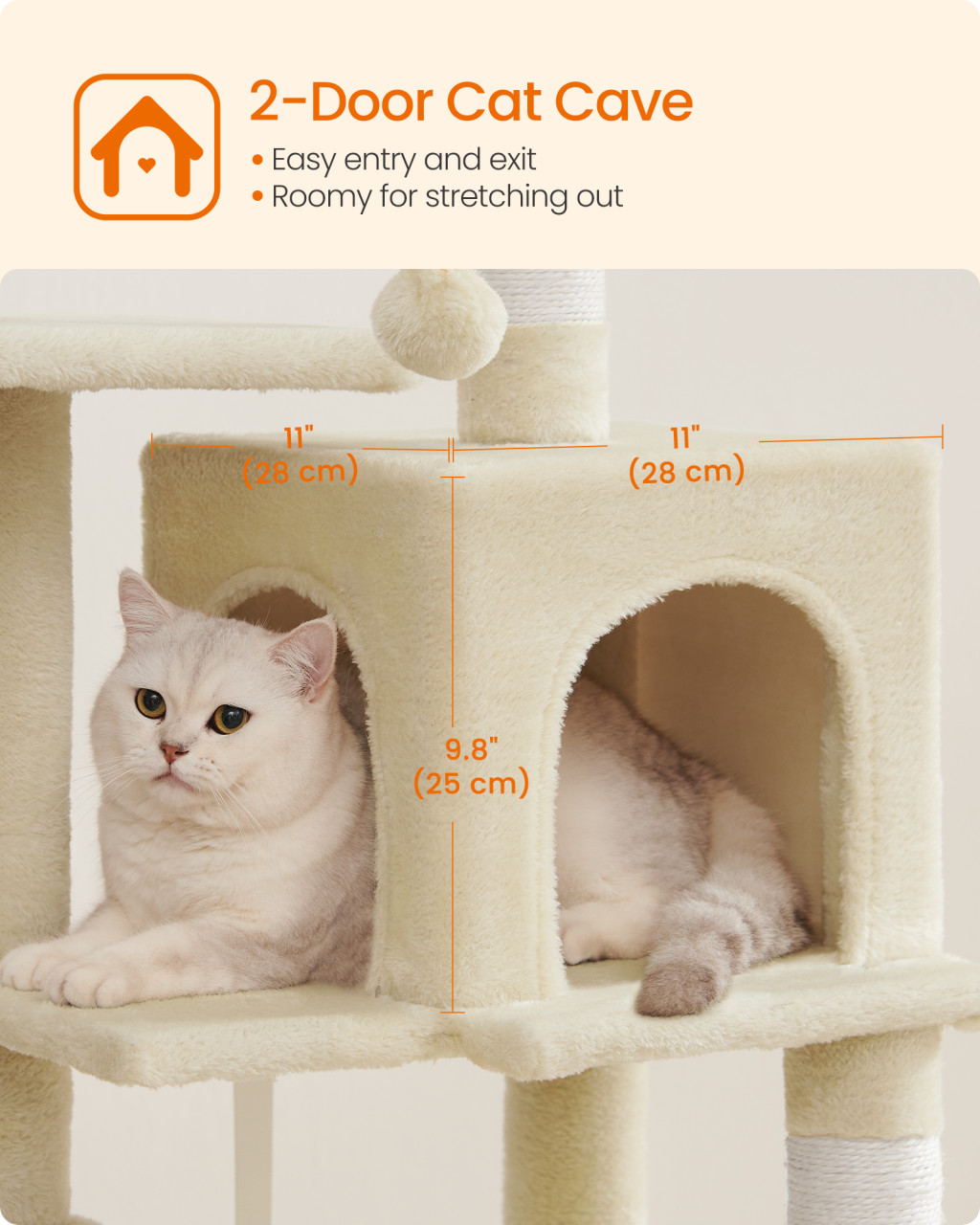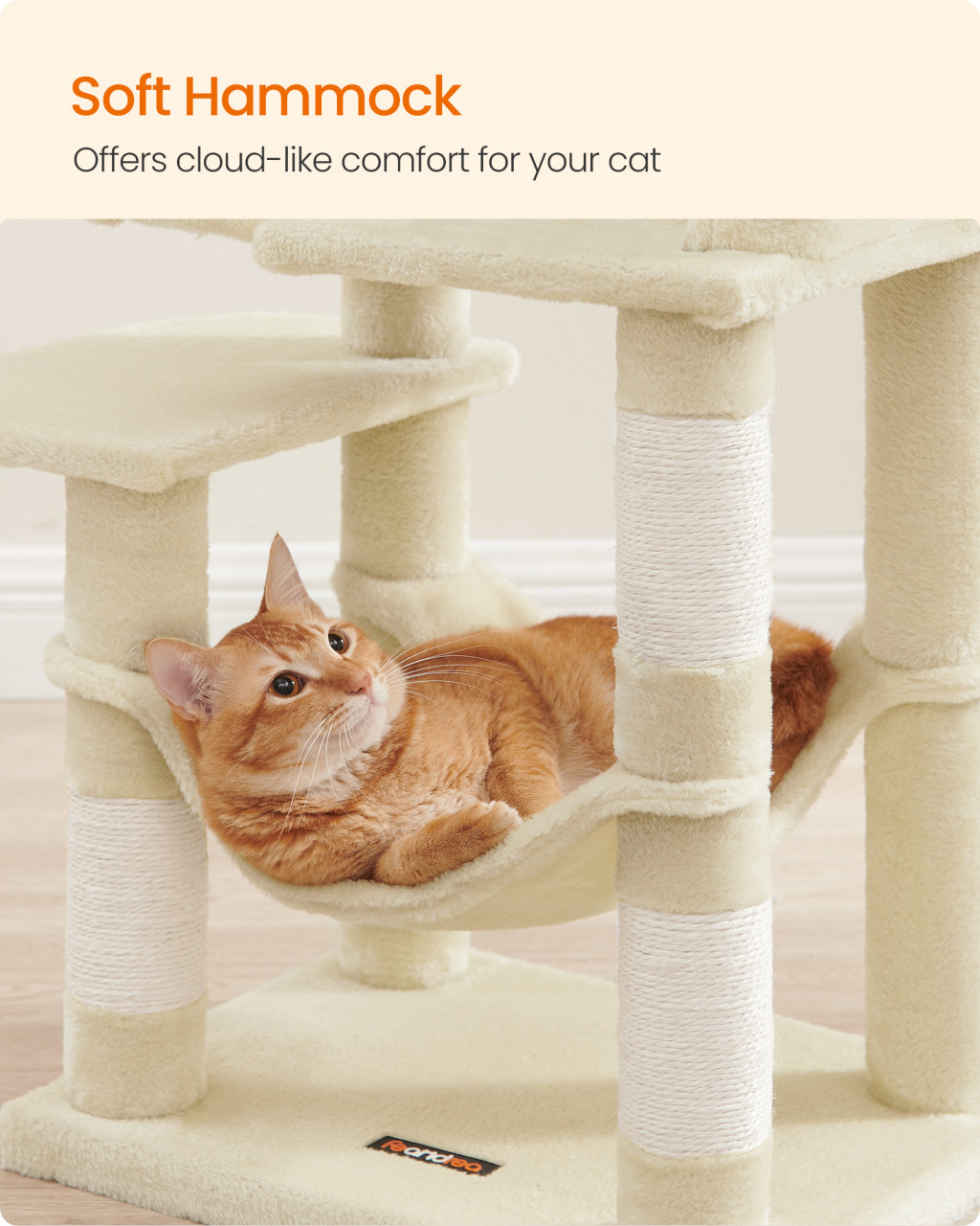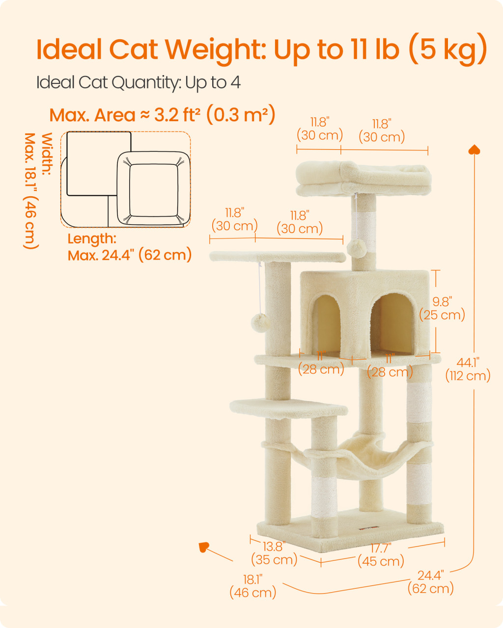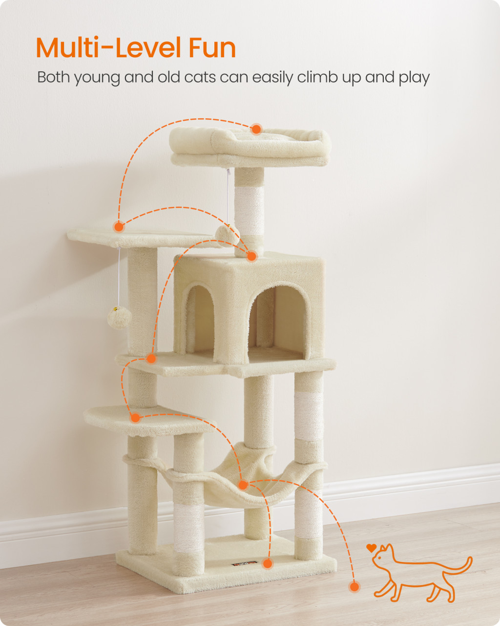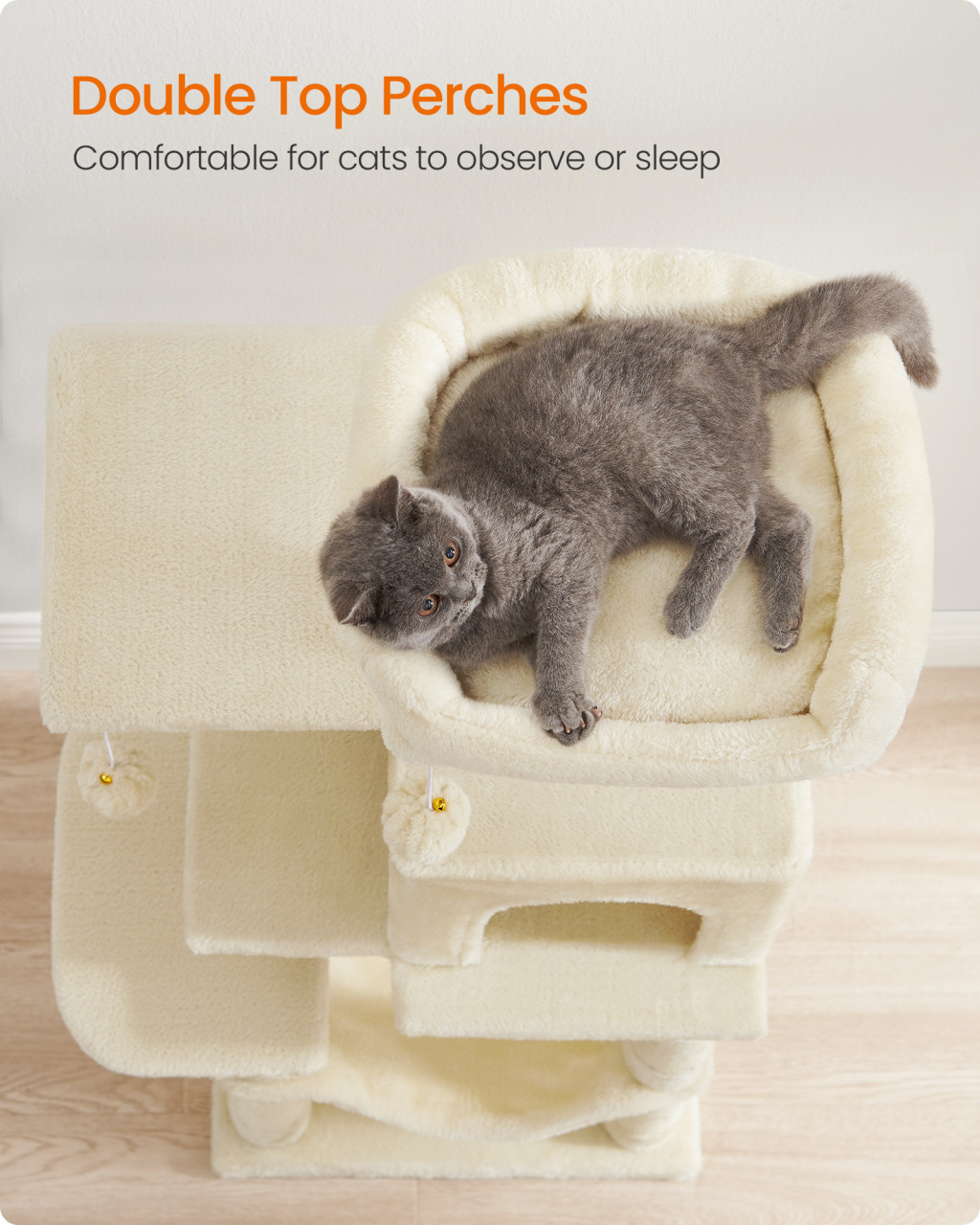 • Számos pihenőhely: Két felső pihenőhely és egy kényelmes macska barlang biztosítja, hogy minden kis kedvenc megtalálja a számára legjobb helyet a pihenéshez.