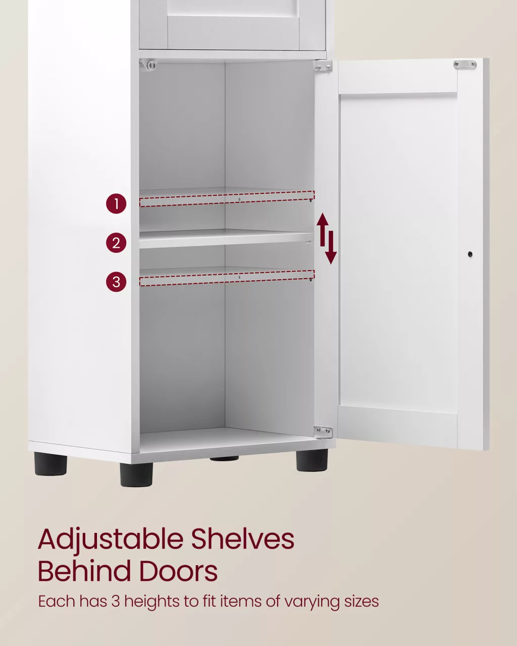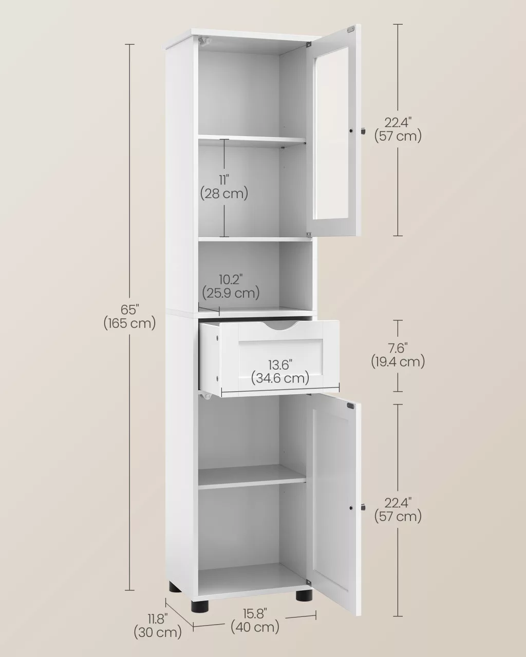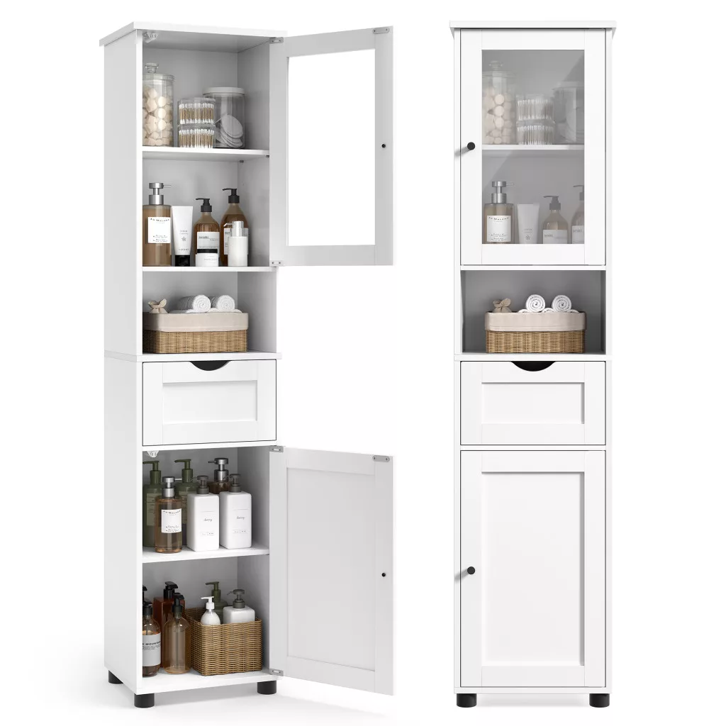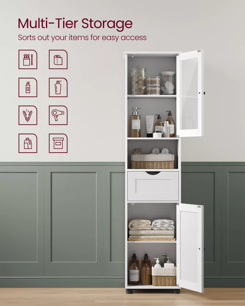 Magas fürdőszoba szekrény, keskeny tároló szekrény, üvegajtós, fehér