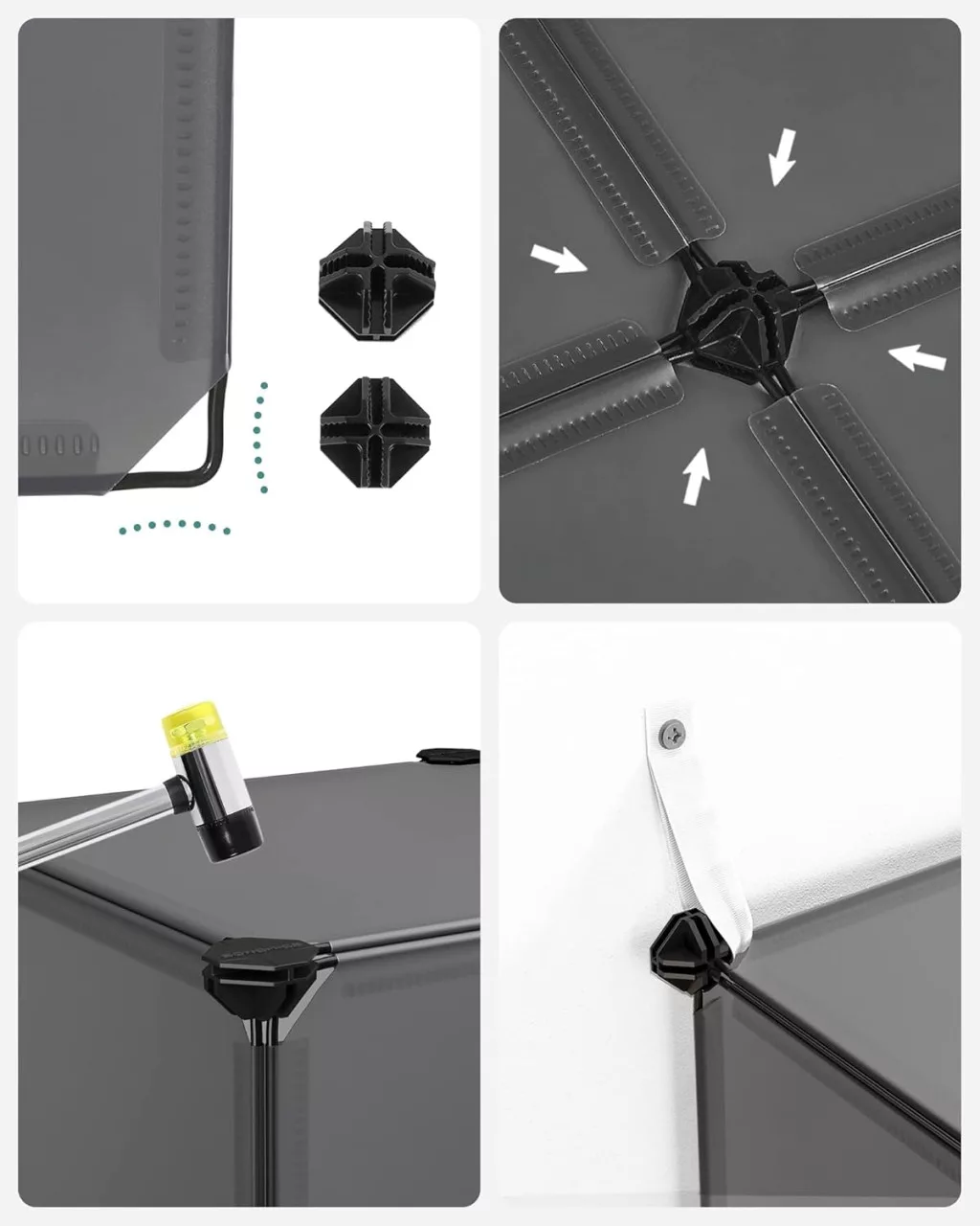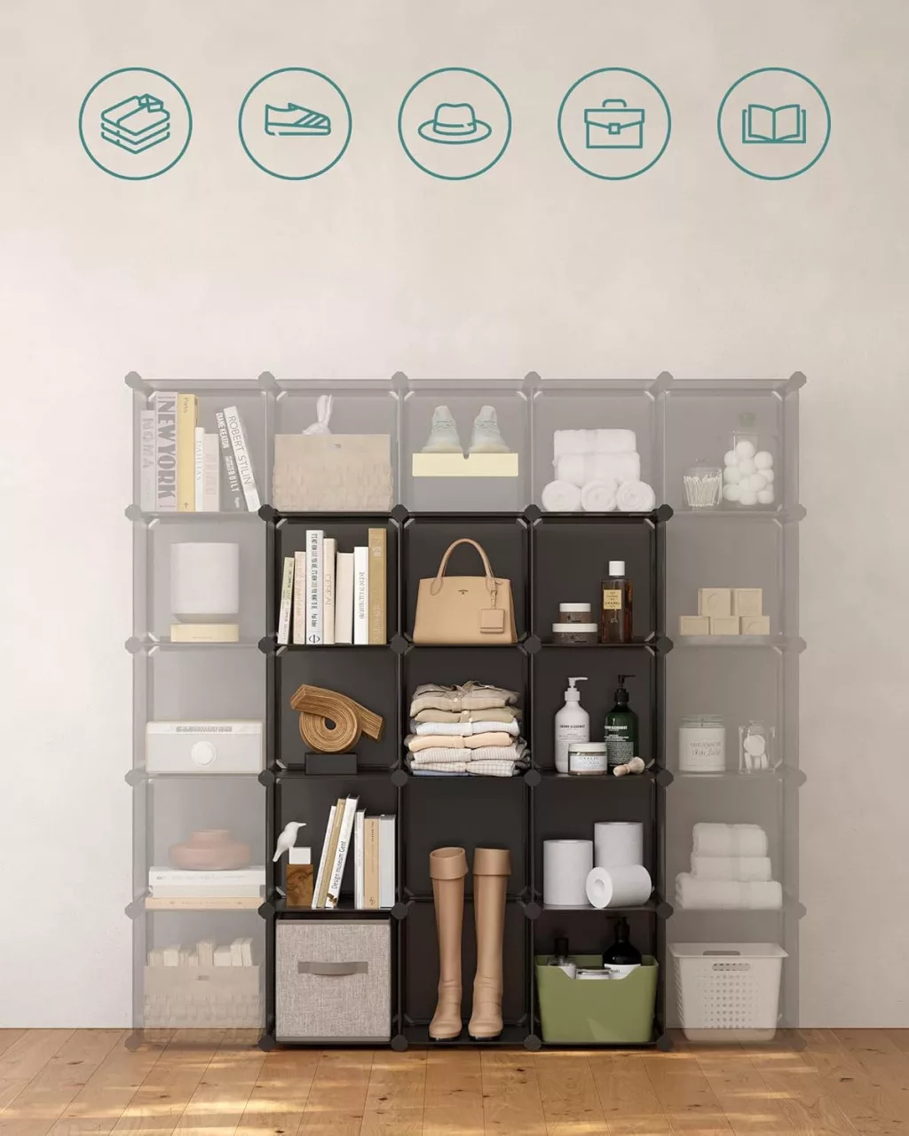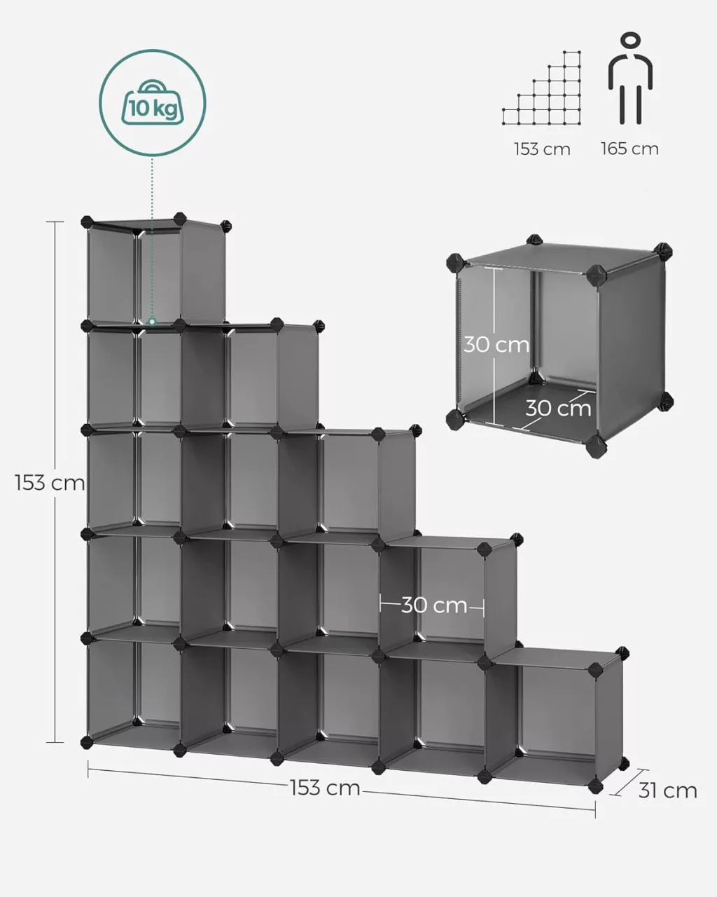 Ha eleged van a rendetlenségből és a helyhiányból, akkor a moduláris cipőtartó tökéletes megoldás számodra. Ez a praktikus tároló 15 összekapcsolható rekesszel rendelkezik, amelyek mindegyike 30 x 30 x 30 cm-es méretű, így ideális ruhák, cipők, könyvek és egyéb tárgyak tárolására. Az alábbi előnyöket élvezheted a használatával: